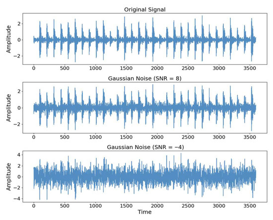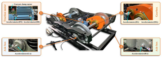 The BJTU-RAO Bogie Dataset is based on a reduced-scale experimental configuration designed to replicate real-world railway operations, encompassing individual and combined fault categories. As depicted in Figure 6, the test rig incorporates a power transmission system featuring traction motors, driving gearboxes, and axle boxes. During data acquisition, the experimental parameters controlled included motor speeds of 20, 40, and 60 Hz (simulating different train velocities) and lateral loads of 0, +10, and −10 kN (representing straight-line travel and curve negotiation, where positive and negative values represent loading directed toward the motor and gearbox sides, respectively). The dataset comprises four signals acquired from 24 channels, triaxial vibration, three-phase current, rotational speed, and acoustic data, each sampled at 64 kHz for 10 s. For this research, acceleration data from channel 16, situated at the gearbox output shaft, were evaluated to examine bearing faults within the gearbox.