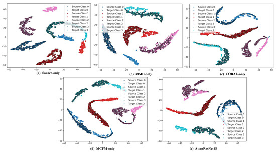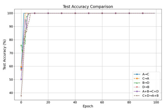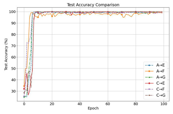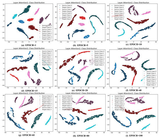Figure 20 illustrates that during the initial phases (epochs 1 to 15), the target domain feature clusters exhibit significant differences from the source domain, with only slight overlap. This pattern reflects a typical domain shift, during which the model’s accuracy increases rapidly (Figure 19), indicating that it initially prioritizes learning from source domain features to mitigate the distribution discrepancy. During the intermediate training phases (epochs 20 to 40), the feature points progressively converged, increasing overlap and a tendency towards similar distributions. By the later stages (epochs 60 to 100), the distributions become more compact, with clear class boundaries and a significantly reduced domain gap, underscoring the effective mitigation of domain shift and the successful transfer of knowledge.