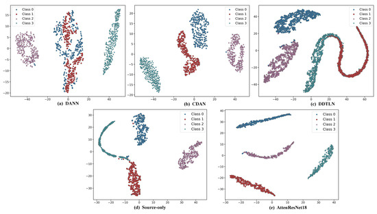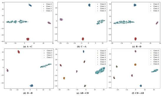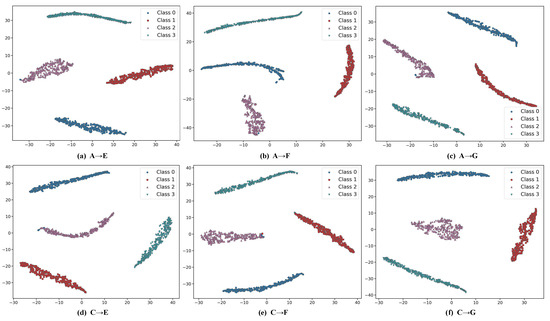 Figure 8 illustrates the two-dimensional representations of high-dimensional data using t-distributed stochastic neighbor embedding (t-SNE) [40]. For each task, the feature groups are distinctly separated without overlap, suggesting that the model successfully captures discriminative and transferable features.