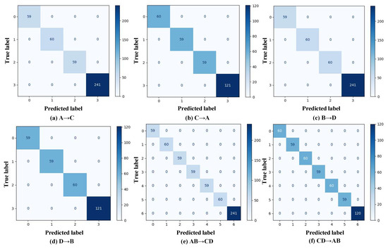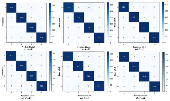 Figure 9 displays the confusion matrices. All diagonal entries show 100% accuracy, with zero off-diagonal values, confirming perfect classification performance despite class imbalance. These results illustrate the model’s adaptability to imbalanced datasets and strong generalization ability under varying working conditions on the same machine.