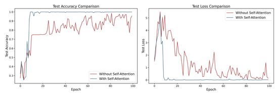 Table 2 outlines the specific parameters of the AttenResNet18 model. This research used the classical ResNet18 [34] as the core architecture and introduced several enhancements. Initially, given the considerable complexity of the original ResNet18 framework, it tends to overfit to noise and extraneous details when analyzing bearing vibration signals affected by interference, potentially compromising its precision. To counteract this, we halved the channel count in each convolutional layer, thereby reducing both the parameter volume and computational load, which helps prevent overfitting to noise and non-pertinent characteristics. Dropout layers were incorporated within the BasicBlock and before the fully connected layer. Randomly dropping redundant computational units enhances the model’s regularization capability, mitigates overfitting, and improves both robustness to noise and generalization performance. Second, to overcome the locality limitation of traditional convolution, the one-dimensional self-attention mechanism was applied after extracting initial local features and higher-level abstract features, with its architecture illustrated in Figure 4.
