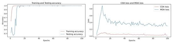 To further interpret the model behavior, we analyzed MDA and CDA losses (Figure 19). The MDA loss spikes early, likely due to noisy or unstable features. The DBDA mechanism, through dynamic adjustment of the weights of the CDA and MDA loss during training, reduces the MDA loss. After 20 epochs, both losses stabilize, matching the improved feature clustering and accuracy, confirming the method’s effectiveness.