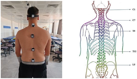 The sensors were fixed to the body using medical tape and elastic fixators to reduce skin artifacts and alignment errors. Sensors were calibrated by anatomical alignment prior to placement, with fixed bony landmarks ensuring consistent positioning across participants. To minimize misalignment and placement errors, sensors were positioned relative to spinous processes (C1, C7, T5, T12, and L5) by the same trained investigator. Each sensor was manually aligned with the sagittal, coronal, and transverse planes during placement. Elastic straps and medical tape were used to prevent sensor tilt or displacement during movement. Prior to recording, sensors were zeroed in the upright posture to reduce orientation bias. Drift and noise were minimized using Madgwick’s filtering and repeated calibration checks before each trial. Thus, misalignments were prevented, and the sensors were ensured to work correctly. The placement of the sensors at the specified points is shown in Figure 2. As illustrated in Figure 2, the sensor placement defines specific spinal segments that were used consistently across all analyses: C1–C7 for cervical lordosis, C7–T12 for thoracic kyphosis, T12–L5 for lumbar lordosis, and lateral (Y-axis) deviation across C1–L5 for scoliosis. These definitions were selected to align with established radiographic standards in spinal biomechanics.