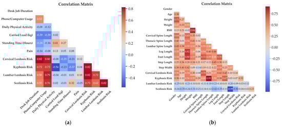 The relationships between daily living activities, cervical lordosis, thoracic kyphosis, lumbar lordosis, scoliosis, and pain were examined in the correlation matrix given in Figure 3a. Because multiple pairwise correlations were explored for a small cohort, the results were interpreted with caution. False discovery rate (FDR) correction was applied to control for multiple testing, and only associations remaining significant after adjustment were considered in the discussion. Cervical lordosis, thoracic kyphosis, lumbar lordosis, and scoliosis deviation categories were defined by angle changes that exceed the expected values. The analyses included correlation and regression analyses to evaluate the effects of daily living habits on different posture segments. A negative correlation increases as you move towards the blue color, and a positive correlation increases as you move towards the red color. In Figure 3b, the relationships between demographic characteristics, such as gender, age, height, weight, and BMI, and anthropometric measurements, such as vertebral column length (cervical, thoracic, and lumbar spine length), leg length, foot length, step length, step width, and cervical lordosis, thoracic kyphosis, lumbar lordosis, and scoliosis were examined in the correlation matrix. A negative correlation increases as you move towards the blue color, and a positive correlation increases as you move towards the red color.
