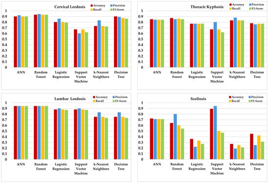 For cervical lordosis deviation, RF, DT, and ANN achieved a relatively high and balanced performance across metrics, with RF reaching the best balanced accuracy. In thoracic kyphosis, RF and ANN again showed a competitive performance, while KNN provided moderate but consistent results. For lumbar lordosis, RF and ANN remained among the stronger models, although other algorithms showed room for improvement. In scoliosis screening deviation, performance levels were lower and more variable across models, largely due to class imbalance and the complexity of lateral and rotational deviations. In this case, SVM provided the most stable results. However, scoliosis classification should be considered descriptive only, since only one positive case was present in the cohort (Table 5), leading to ≤1 positive in several folds and unstable estimates despite oversampling. Balanced accuracies ranged between 0.55 and 0.82 depending on the model and risk category, while AUPRC values consistently exceeded baseline levels. Majority-class baselines ranged from 0.53 (thoracic kyphosis) to 0.87 (lumbar lordosis). Positive case counts were cervical lordosis = 6, thoracic kyphosis = 16, lumbar lordosis = 4, and scoliosis = 1, with some folds containing ≤1 positive case for scoliosis. These results highlight both the potential and the instability of ML approaches in small and imbalanced samples. Although the accuracy, precision, recall, and F1 score are displayed in Figure 4, interpretation should primarily rely on balanced accuracy and AUPRC due to substantial class imbalance. Majority-class baselines are reported in the Results Section to aid comparison.