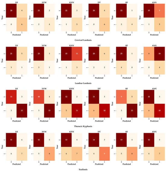 Six different ML algorithms were applied and compared for anatomic posture analysis. Logistic Regression (LR), Support Vector Machine (SVM), K-Nearest Neighbor (KNN), Decision Tree (DT), Random Forest (RF), and Artificial Neural Network (ANN) algorithms were evaluated (Figure 4). To address class imbalance and ensure reproducibility, all models were trained within subject-wise LOSO and/or stratified k-fold schemes; per-fold oversampling (SMOTE or ROS) and, where applicable, class_weight = “balanced” were used. Performance was reported with accuracy, precision, recall, F1 score (weighted), and 95% Wilson confidence intervals; fold-level confusion matrices were computed. For scoliosis, balanced accuracy and AUPRC are unstable due to only one positive case; these results are presented descriptively only. Aggregate confusion matrices under the stratified five-fold scheme are shown in Figure 5. Fold-level matrices were not included due to space constraints, but the aggregate results summarize the performance across folds. Scoliosis confusion matrices reflect extremely low positive counts (n = 1) and thus provide descriptive rather than confirmatory evidence. Hyperparameters were tuned by stratified k-fold cross-validation on the training folds only, using balanced accuracy as the objective. Per-model settings are given in Table 2.