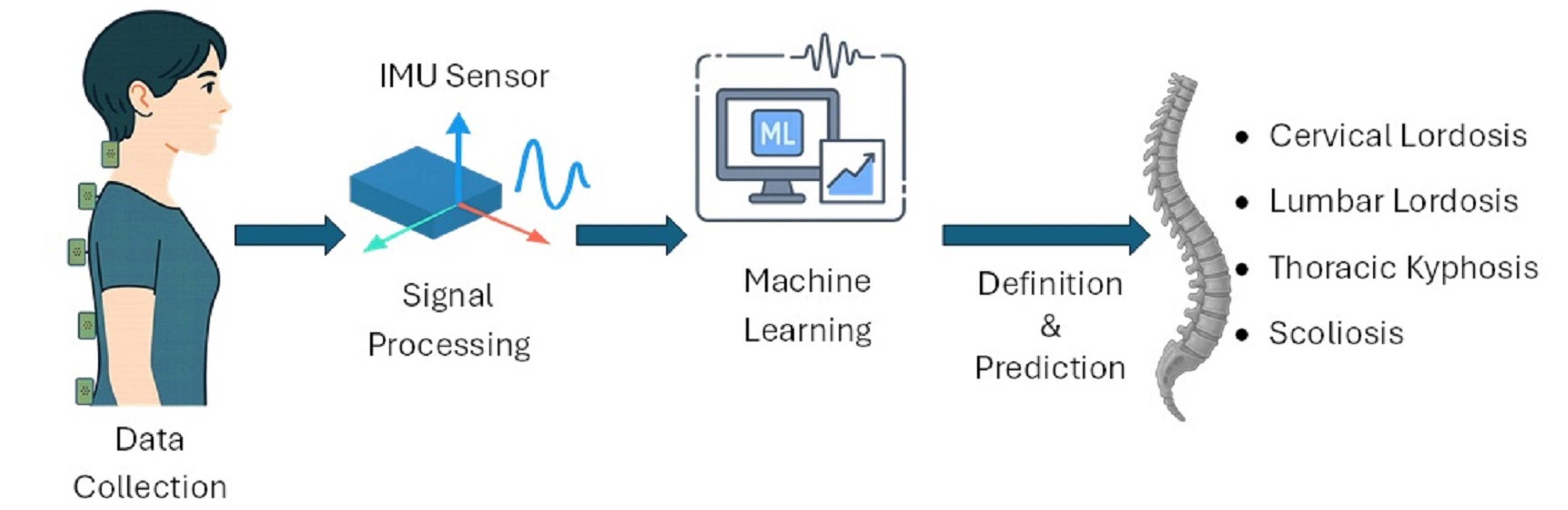Spinal posture was analyzed using IMU sensors, and classification was performed with ML algorithms. ML analyses indicated that RF and ANN consistently achieved a strong and balanced performance across cervical and lumbar lordosis risk prediction, while DT also performed competitively in cervical outcomes. For thoracic kyphosis, RF and ANN again showed a robust performance, whereas KNN provided moderate but stable results. In contrast, scoliosis risk prediction yielded more variable outcomes; SVM achieved the most reliable performance, but precision and recall values fluctuated due to class imbalance and the rotational nature of scoliosis. These findings suggest that sagittal plane deviations (lordosis, kyphosis) can be captured more reliably by wearable IMU sensors, whereas coronal and rotational deviations (scoliosis) remain technically challenging. The overall classification accuracy across outcomes ranged between 0.60 and 0.90, depending on the model and risk category. This underscores both the potential and the limitations of ML approaches in small, imbalanced datasets. Importantly, the “risk” labels in this study represent subclinical deviations from normative posture rather than clinical diagnoses, suggesting their potential utility as preventive indicators rather than diagnostic endpoints. However, significant fluctuations were observed in model performances in scoliosis prediction. These inconsistencies were especially apparent in coronal plane predictions such as scoliosis. Unlike sagittal movements, which are typically larger in amplitude and more easily captured by IMU sensors, coronal and rotational deviations tend to be subtle and multidimensional. This increases their sensitivity to minor sensor misalignments, soft tissue movement, and measurement noise—particularly along the Y-axis. Therefore, the performance variation observed across models in coronal parameters is likely due, at least in part, to the complexity and technical limitations in capturing lateral and rotational spinal movements with wearable sensors. SVM gave the best result for scoliosis prediction. On the other hand, there were inconsistencies in precision and recall values. This indicates that additional datasets or alternative modeling approaches should be evaluated for scoliosis prediction. Our study provides a feasibility analysis where IMU-derived posture angles were used to define proxy risk labels and ML classifiers explored their associations with demographic, anthropometric, and daily habit variables. These findings are exploratory and should not be interpreted as a clinical diagnosis. In this context, we suggest that our study contributes to the literature.