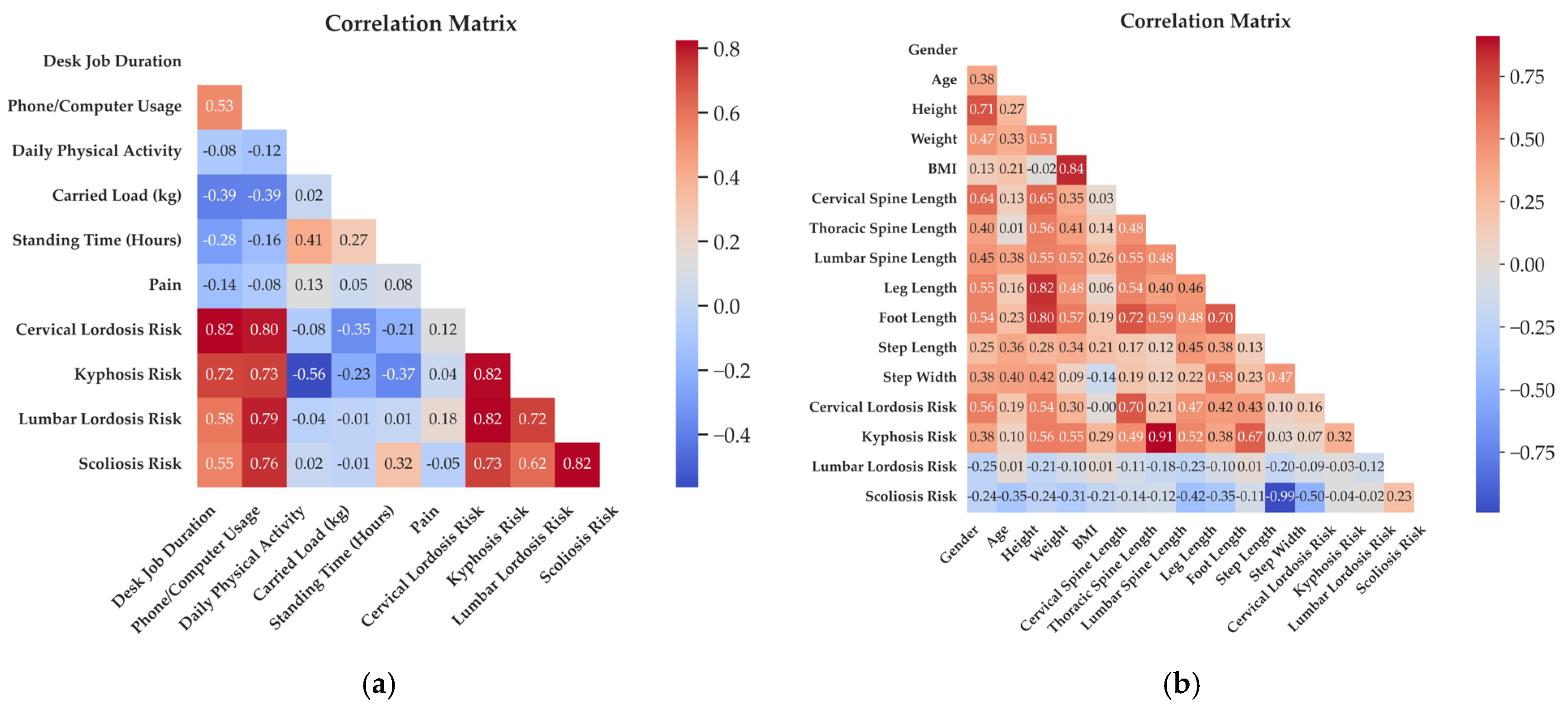 Figure 3b, the relationships between demographic characteristics, such as gender, age, height, weight, and BMI, and anthropometric measurements, such as vertebral column length (cervical, thoracic, and lumbar spine length), leg length, foot length, step length, step width, and cervical lordosis, thoracic kyphosis, lumbar lordosis, and scoliosis were examined in the correlation matrix. A negative correlation increases as you move towards the blue color, and a positive correlation increases as you move towards the red color.