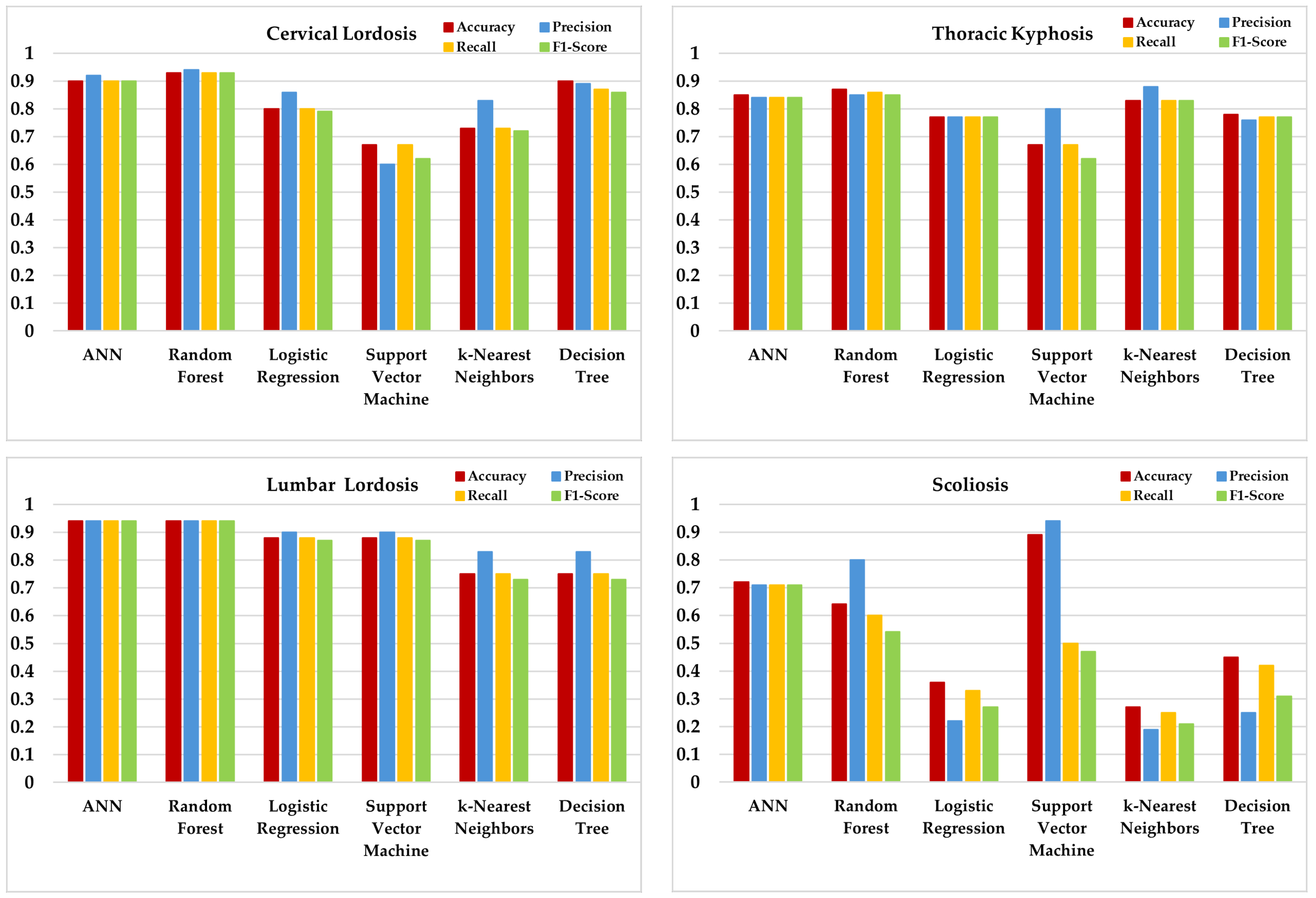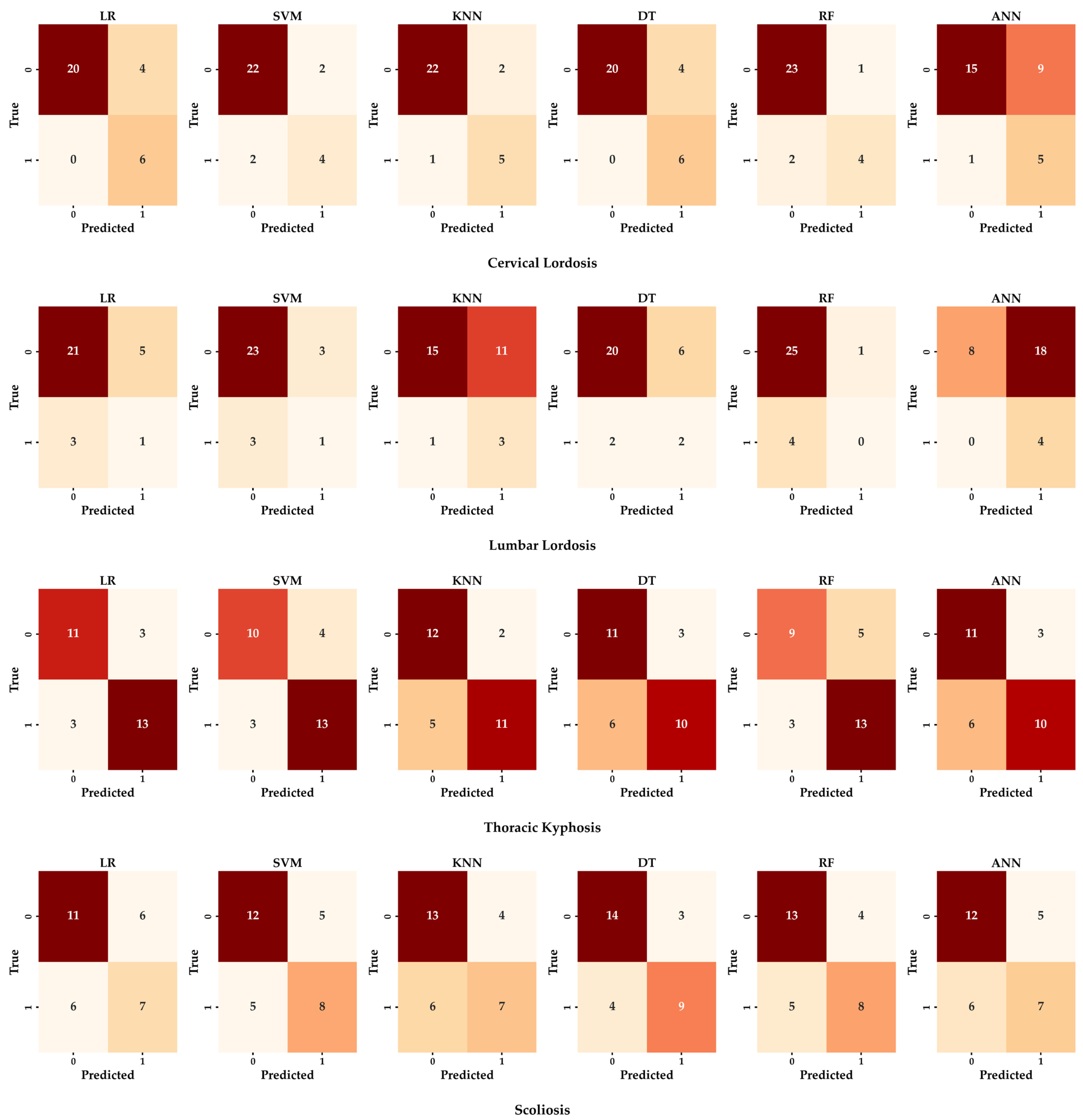 For cervical lordosis deviation, RF, DT, and ANN achieved a relatively high and balanced performance across metrics, with RF reaching the best balanced accuracy. In thoracic kyphosis, RF and ANN again showed a competitive performance, while KNN provided moderate but consistent results. For lumbar lordosis, RF and ANN remained among the stronger models, although other algorithms showed room for improvement. In scoliosis screening deviation, performance levels were lower and more variable across models, largely due to class imbalance and the complexity of lateral and rotational deviations. In this case, SVM provided the most stable results. However, scoliosis classification should be considered descriptive only, since only one positive case was present in the cohort (