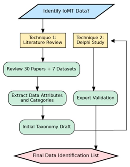 In this stage, two scientific techniques will be used: First, a comprehensive review of scientific papers and IoMT datasets has been conducted for the identification. The findings are amalgamated into a unified taxonomy encompassing all data categories identified thus far. These data categories will be used as a raw material for the data classification process. In this study, 30 scientific papers and 7 IoMT datasets are included to systematically extract and categorize the used IoMT data, facilitating the development of a standardized taxonomy for IoMT devices. The second technique is Delphi technique which will be used for validating the findings to ensure the correctness of this standard list. This Delphi technique will be conducted with domain experts. Figure 1 illustrates the methodology. The next subsection will discuss the methodology steps in detail.