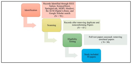 In this step, the research papers mentioning specific types of data extracted from IoMT devices were searched. These papers are limited to those located via the IEEE Xplore, ScienceDirect, SpringerLink, MDPI, Hindawi, the ACM Digital Library, and Google Scholar. We chose the systematic review process PRISMA (Preferred Reporting Items for Systematic Reviews and Meta-Analyses) to identify suitable studies and reduce the number of results for this review as shown in Figure 2. In the review process, there are three sequential steps, which are identification, scanning, and eligibility testing. Papers are identified in the identification step using a Google Scholar search. To retrieve relevant articles and papers, following search string is applied: (Data Types OR Data Categories OR Data Identification) AND (IoMT OR IoHT OR “IoT in Healthcare System”). In total, 70 papers were identified in total that focus on IoMT healthcare systems. After removing duplicate and nonconforming papers during the scanning process, 45 papers were chosen. Next, we eliminated the papers which did not specify any type of IoMT data during the eligibility testing phase. Following this last stage, we decided to include 30 papers.