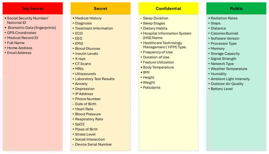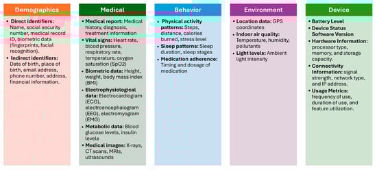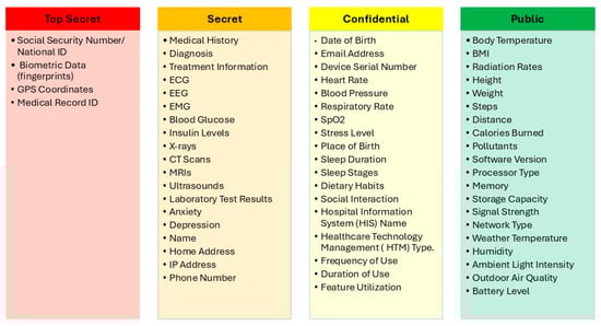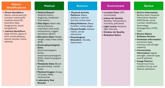 - Device Data: This includes technical information about the IoMT devices themselves, such as battery life, connectivity status, sensor readings, and device settings [28,37,44]. Device data is used to ensure the proper functioning of IoMT systems and to identify potential technical issues.