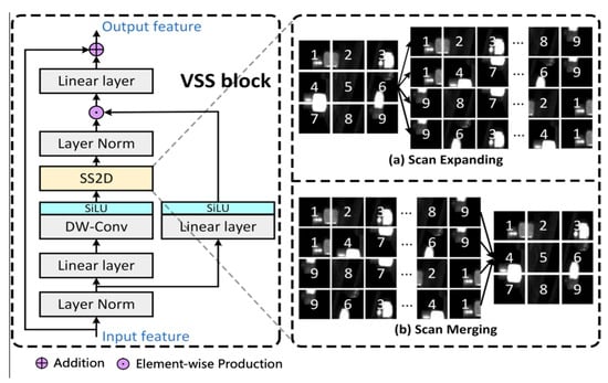 where B, C ∈ RD×N. We derive an approximation of using the first-order Taylor series. Next, the Visual Mamba further integrates the Cross-Scan Module (CSM) and convolution operations into the block [28]. In the VSS block, the feature flow first passes through the linear embedding layer, and then bifurcates into dual pathways. The feature flow in a branch first undergoes depth-wise separable convolution [40] and SiLU activation functions; then, the feature flow is introduced into the SS2D module and layer normalization module; finally, it merges with the feature flow from another branch that passes through a linear layer and SiLU activation function. Unlike typical visual Transformers, this VSS block omits positional embedding operations and ops for streamlined structures without an MLP stage, resulting in denser block stacking within the same depth budget. Note that SS2D includes ‘Scan expanding’ and ‘Scan merging’, as shown in the figure below.
