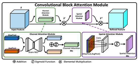 The convolutional block attention module (CBAM) is a simple, effective, and plug and play attention module. As shown in Figure 2, for a given intermediate feature map input, the module infers attention maps along two independent dimensions (channel and spatial spatial) in order. The calculation question can be written as follows [41].