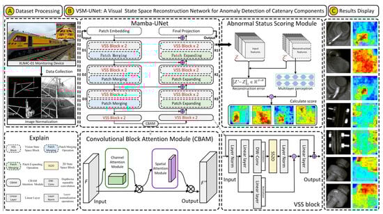 In recent advancements in industrial anomaly detection, distance-based methods require manual specification of feature centers, posing challenges when handling complex, large-scale datasets. In the domains of one-class classification and image reconstruction, researchers commonly employ encoder–decoder architectures composed of Convolutional Neural Networks (CNNs) and Transformers, which are primarily utilized for detecting significant anomalous features (CNN), yet are less sensitive to subtle variations. Furthermore, both CNNs and Transformers face limitations: CNNs exhibit weak long-range feature correlation capabilities, while Transformers suffer from high computational complexity. As a result, these methods struggle to fully leverage their performance when applied to the detection of minute anomalies, such as loosening or missing components in catenary systems. Fortunately, VMamba, based on state-space models (SSMs) [28], not only effectively associates long-range features within feature maps through a continuous scanning mechanism, enhancing feature extraction performance, but also offers a more compact parameterization and reduced model complexity compared to similarly scaled Transformer models. Moreover, with a topology akin to Swin-Transformer, VMamba integrates effectively with attention mechanisms, amplifying the model’s sensitivity to minor anomalies [29,30,31,32,33,34].
