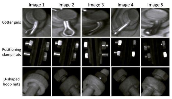 The data collected in this experiment are global images of the catenary support components, which were taken by a high-speed rail inspection vehicle along a certain railway line (the original images collected include a total of 6151 pictures). We used 5226 selected images with clear quality and meeting the requirements to construct the data set for this experiment, as shown in Figure 4. It is worth mentioning that in actual working conditions, more than half of the abnormal conditions (such as loosening) of contact network support components often occur in cotter pins, positioning clamp nuts, U-shaped hoop nuts, and other parts. To this end, we employed the YOLOv8 object detection algorithm [44] to extract regional-level images of the three components and selected a portion of samples for anomaly detection. The distribution of the extracted regional-level fastener samples is shown in Table 1. Specifically, we first selected 1000/1000/850 normal samples of positioning clamp nuts, U-shaped hoop nuts, and cotter pins, respectively, for the training set. Next, for each type of fastener, 300 normal samples were selected as positive samples for the test set. Finally, since the abnormal samples (negative samples) were relatively scarce, we applied data augmentation (rotation, flipping, translation) and randomly selected 125, 146, and 173 images, respectively, for inclusion in the test set.