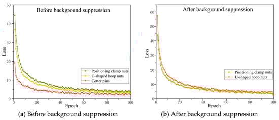 To verify the improvement effect of background suppression on loosening fault identification, this experiment conducted a background suppression experimental analysis on the positioning clamp and U-type hoop nut and used them to train the original UNet model (SAM segmentation algorithm was used for background suppression). The cotter pins are mostly found on catenary parts such as insulator bases and binaural lugs. There are many phenomena such as small scale, relatively uniform background, and low noise interference. Therefore, the background suppression effect will not be discussed. The loss function curve of the training process is shown in Figure 5. It can be seen from the figure that during the training cycle, the model loss continues to decrease and finally converges, and the model is basically fitted at the 100th epoch.