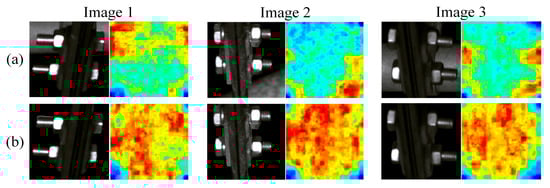 Comparison of abnormal score map of normal positioning clamp nuts ((a) before background suppression, (b) after background suppression).