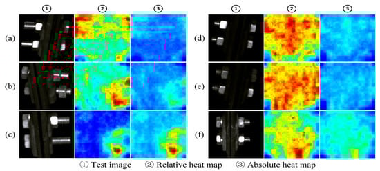 The samples (a), (b), and (c) in the figure are faulty samples, and the nuts are loosened in order of severity. From slightly loose to completely missing, the faulty nut shows an abnormality score higher than the normal area, and the faulty area is located. Among them, the reflection of the gasket on the upper left side of sample (c) leads to a higher score in this area, but there is still a certain gap compared with the real fault area. The samples (d), (e), and (f) in the figure are normal samples, and the relative heat maps of (d) and (e) have large and scattered high score areas. This shows that the abnormality degree of each pixel is relatively consistent. It can be seen from its absolute heat map that the overall score of the sample is low, and no obvious abnormal areas are identified. In sample (f), the lower portion of the part is highlighted due to reflection. This results in a cluster of high scores just below both heatmaps, indicating that the sample was misidentified as a minor anomaly.