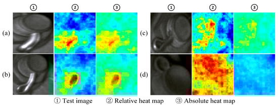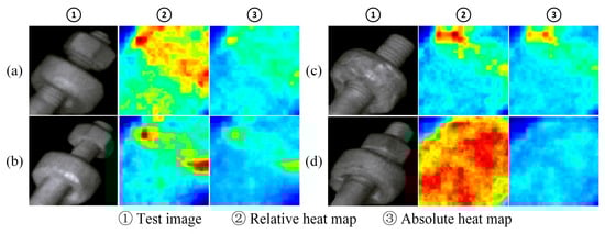 Figure 9 shows the fault location effect of some samples of cotter pins. Among them, sample (d) is a normal sample, while the rest are faulty samples, and the degree of looseness of the cotter pin decreases from sample (a) to (c). As observed in the relative heat map, the high-scoring areas of the fault sample are concentrated near the protruding cotter pin, which is significantly different from the scores of other normal areas. The high-scoring areas of normal samples are distributed over a wide range. It can be seen from the absolute heat map that the overall score of the fault sample is higher, and as the degree of looseness increases, the score at the cotter pin gradually increases. The overall score of the normal sample is very low, which is significantly different from the fault sample.