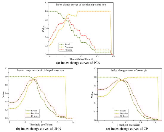 After determining the score value that best characterizes the abnormality of the entire image, the impact of the score threshold on the fault identification effect is another issue to be discussed in this experiment. This experiment uses the anomaly scores of the training set samples as the basis for threshold setting. Considering that the model has learned the training set samples, the abnormal scores of the training set samples will be smaller than the normal samples of the test set. Therefore, this paper uses the result of multiplying the average anomaly score of the training samples by the amplification factor a as the threshold. In this experiment, the threshold coefficient is assigned a value between 1 and 1.3 at an interval of 0.01. The values of the three evaluation indicators of recall, precision, and F1 score of the test set sample change curve with the threshold coefficient, as shown in Figure 10.