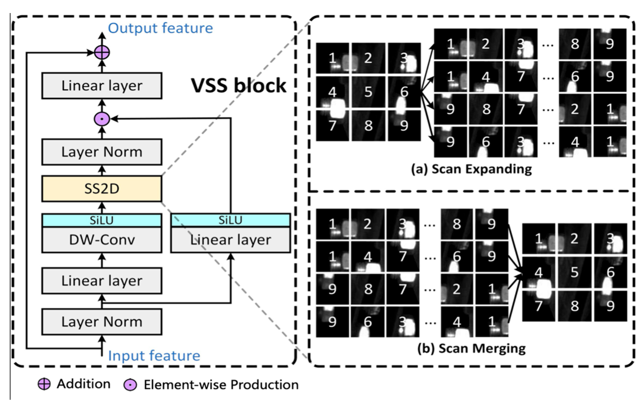 2.3. Visual State Space Reconstruction Network (VSM-UNet)