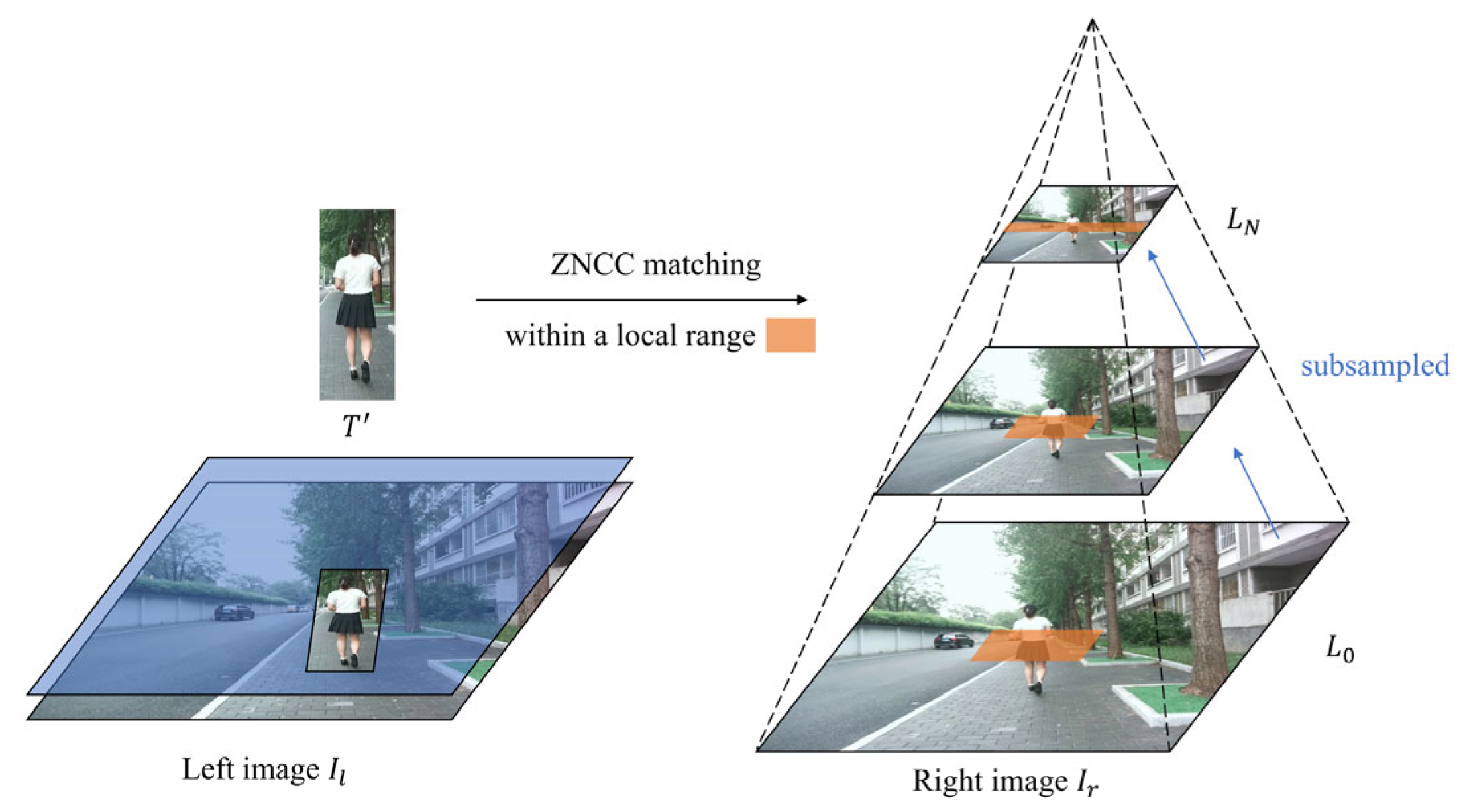 Input: Left image , right image , top image , original target template (from left image) , camera parameter set . Output: The target (in the left camera coordinate system). 1: ImageRectification “Obtaining initial matching from ” 2: = Preprocessing 3: Build image pyramids for and . 4: for from down to 0 do 5: if is then 6: Initial 7: Search 8: else 9: Initial 10: Search 11: end if 12: end for 13: Use for search: 14: 15: Find the best matching point for “Optimization based on ” 16: = Triangulation 17: for in with do 18: Candidate points 19: Extract corresponding to the projection point: 20: Projection 21: Calculate 22: end for 23: 24: return |