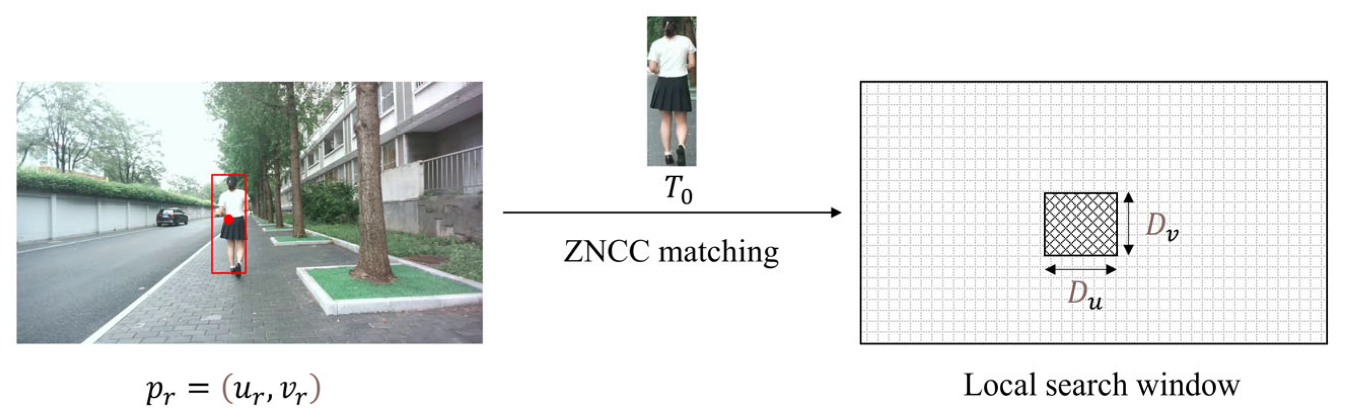 - For each candidate point , we extract corresponding patches, and , from the right view and the top view , centered on their respective projected coordinates, and .