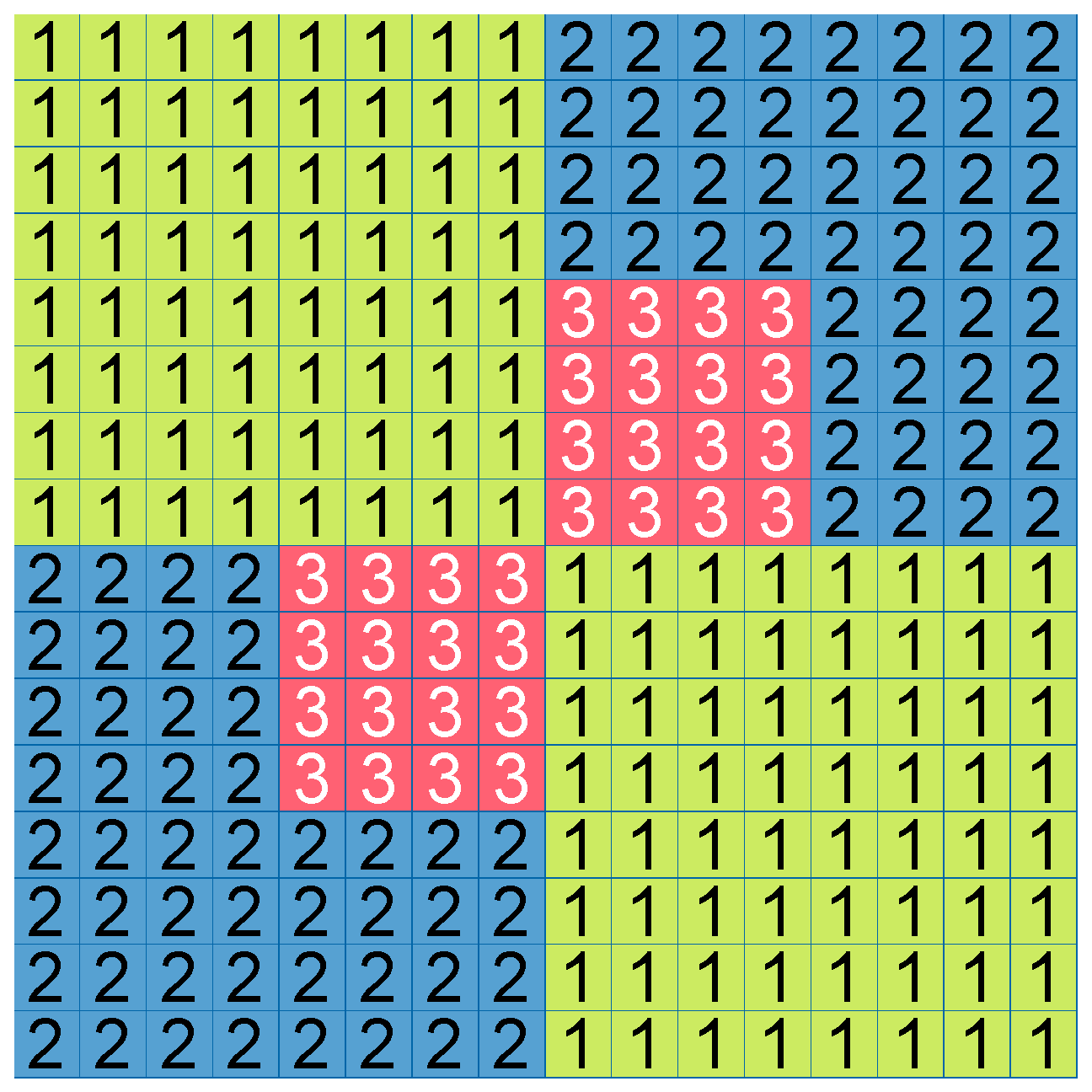 Figure 1 can be signaled as a set of division flags. In the implementation of encoders and decoders, the same information can be stored in a division matrix—a rectangular matrix of the size of 16 × 16 cells (for the CTU size of 64 × 64) that includes the information of the level of division for a given area of CTU. An example of such a matrix for the same case as shown in