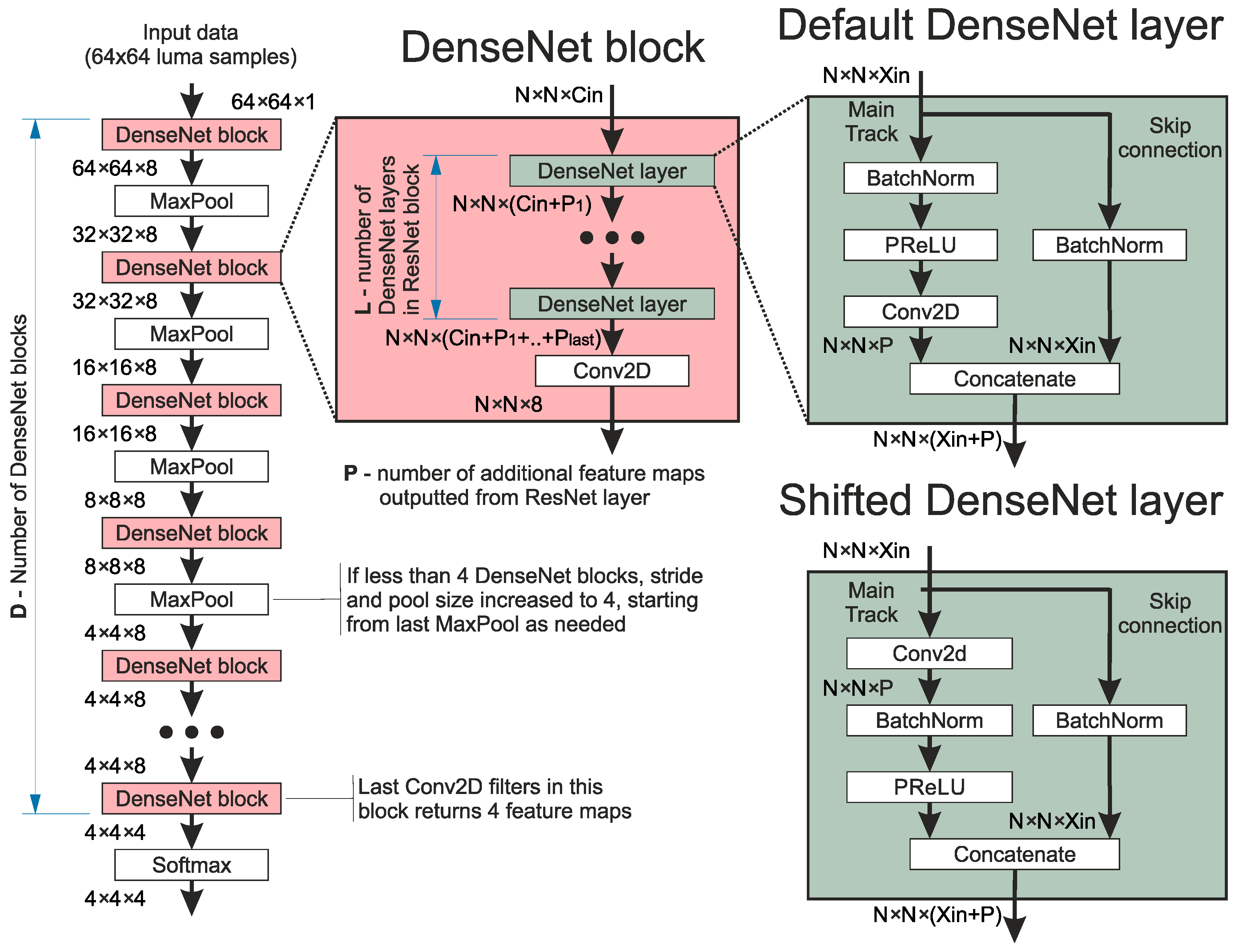 Figure 5. The distinctive part of these networks is the dense connection applied between all DenseNet layers with the DenseNet block. This means that consecutive layers in the blocks jointly process all feature maps, both from the input of the block and all previous layers. In this research, the dense connections are achieved by outputting from the layer the concatenation of generated and inputted feature maps of the given layer. The block always ends with a single Conv2D, which processes accumulated feature maps and reduces their number. In this research, the first block always outputs eight feature maps, while the rest output four feature maps.
