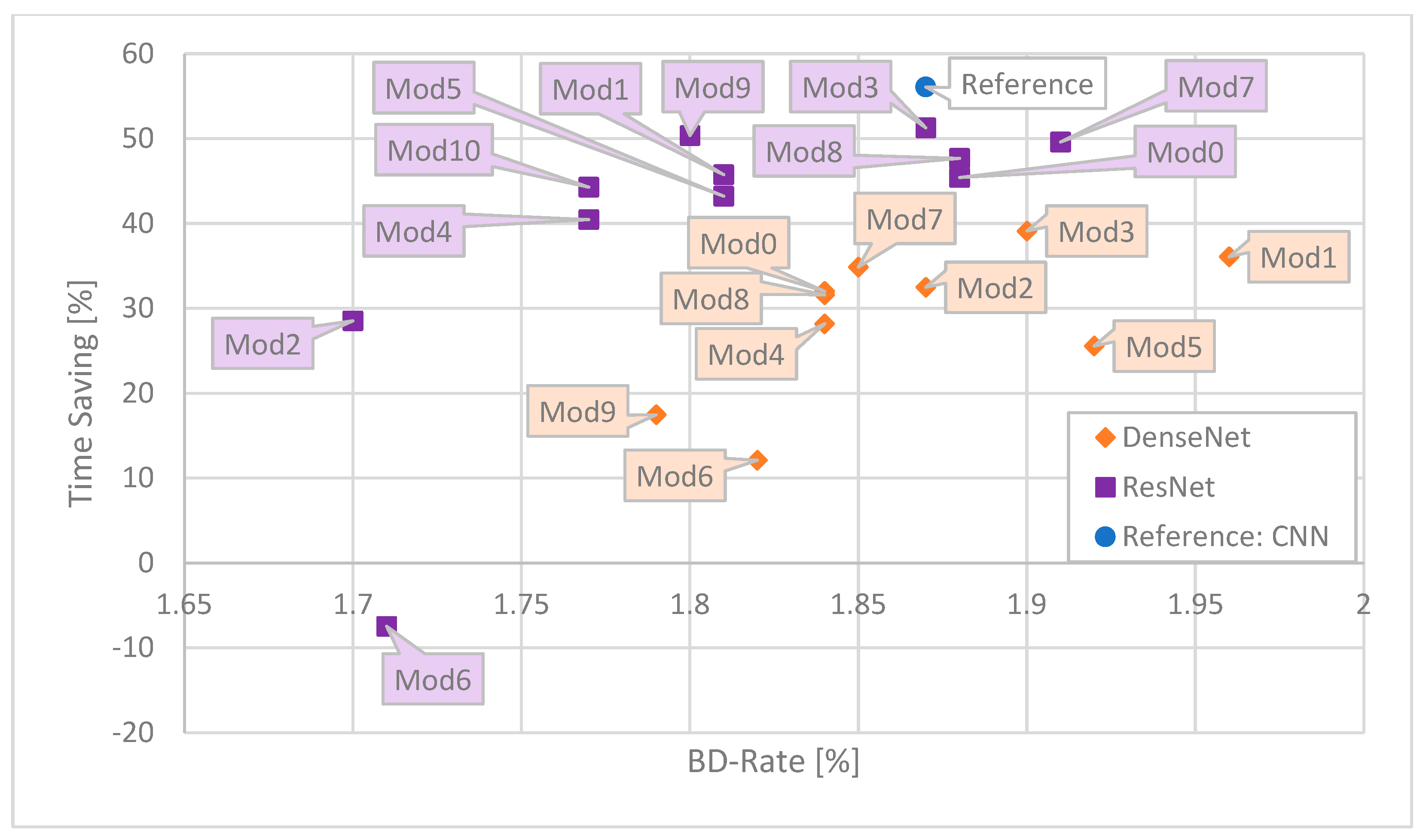 Figure 9. It is worth noting, though, that for hardware-constrained applications, the Time Saving provided by the DenseNet Mod3 network, accompanied by its smallest size, might be more important than the fact that the encoder produces a slightly larger bitstream. Overall, for DenseNet, the bigger the network, the better the BD-Rate. Different observations are made for the ResNet architectures. The BD-Rate result is more related to the block and later setup (Mod2, Mod 4 and Mod10) rather than overall network size (Mod 5 and Mod 6).