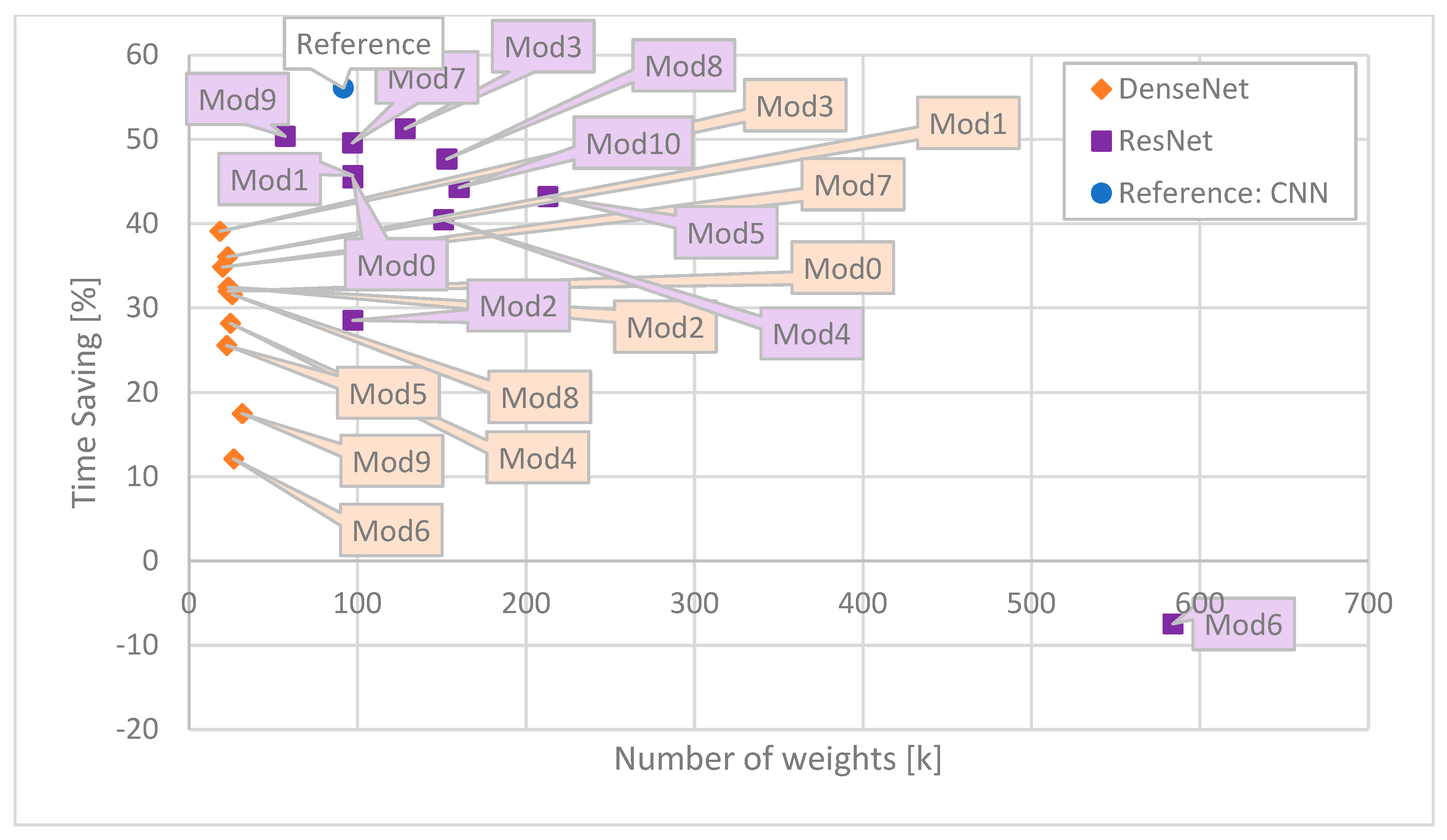 Figure 8, the main advantage of the DenseNet architectures is the number of weights. The smallest ResNet architecture (Mod9) is slightly less than twice as big as the biggest DenseNet (Mod9). Moreover, the DenseNet (Mod9) has three times fewer weights than the reference CNN. Therefore, small size does not come with the encoding time, as most ResNet architectures provide higher Time Savings. In some modifications of ResNet, consecutive ResNet blocks produced more feature maps (Mod3, Mod4, and Mod10) as compensation for a lower number of ResNet blocks. One can observe that for such modifications, despite a significant increase in the number of weights, the Time Savings did not change compared to the Default ResNet (Mod0).