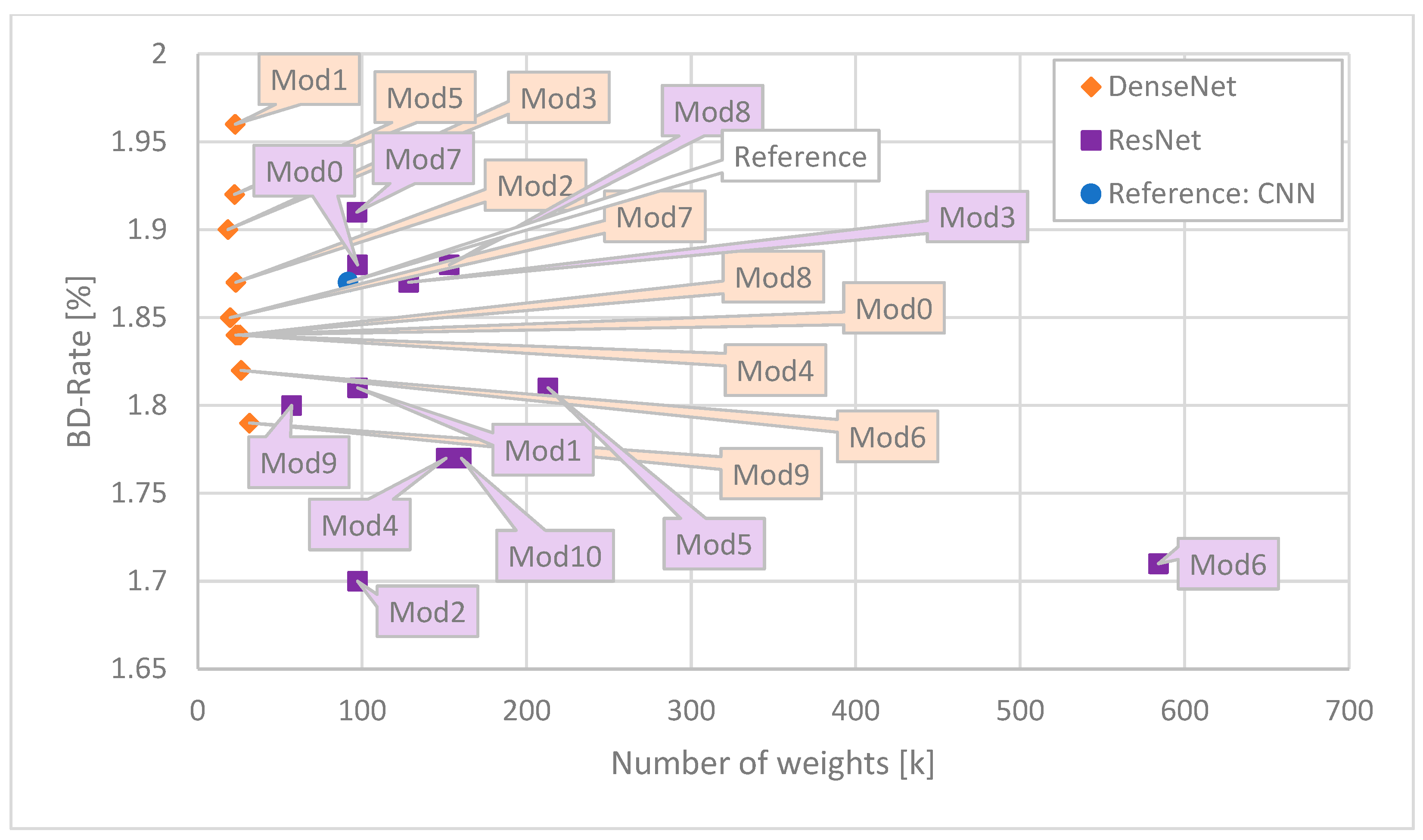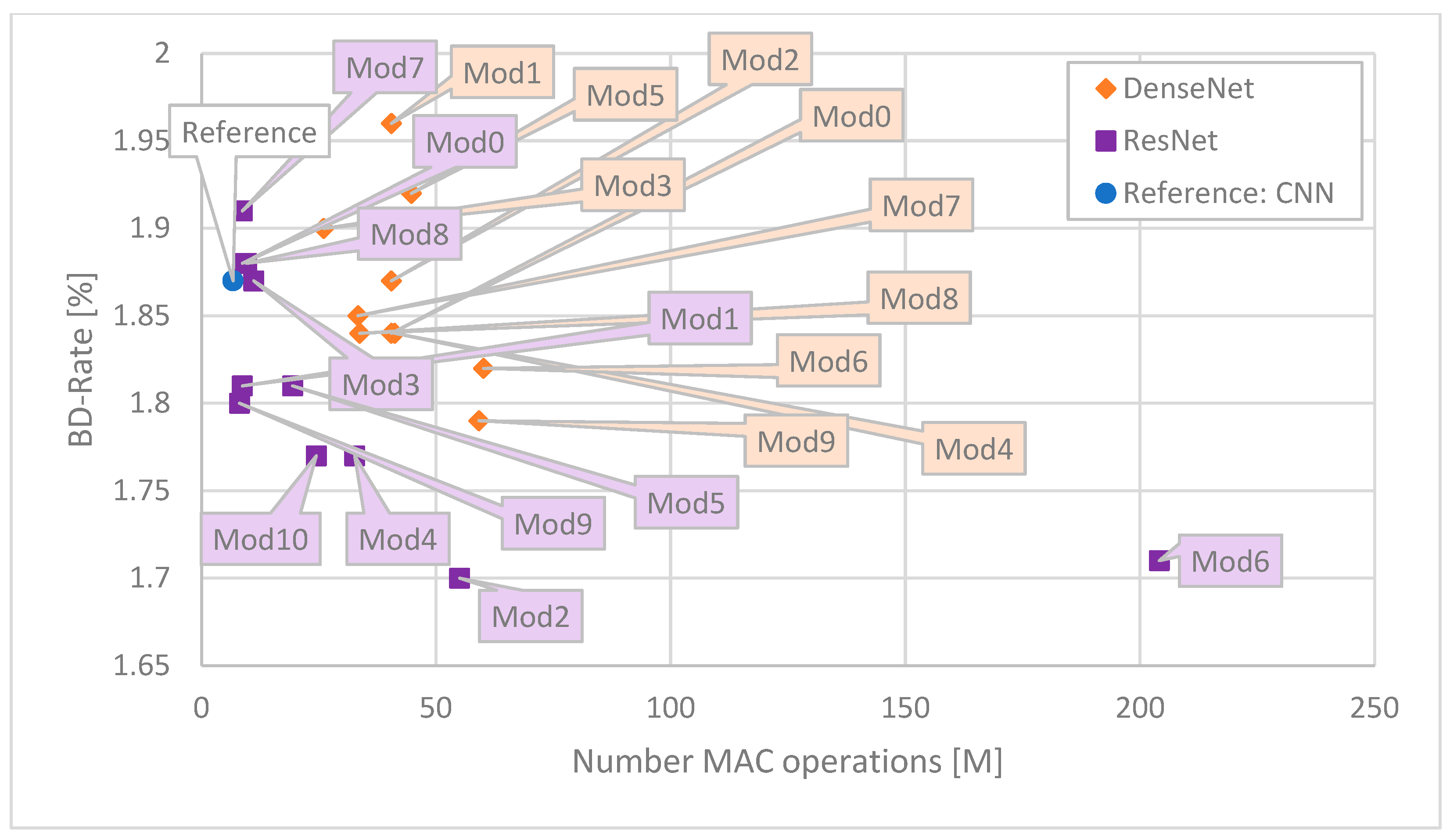 Figure 7, the bitstream produced by the encoder is slightly bigger than the unmodified HM encoder, despite the used network. The two most complex (number of MAC operations) variants of ResNet, Mod 2 and Mod 6, obtained the best results, around 1.7%, which outperforms the reference CNN by ~0.2 p.p. However, the computational complexity of the network is not directly related to the bitstream produced by the encoder. Among the least complex ResNet architectures, in terms of BD-Rate, some of them perform better (e.g., Mod9) and some worse (e.g., Mod 7) compared to the reference CNN architecture. Considering DenseNet architectures, most of the proposed networks outperform the reference CNN, with results comparable to most ResNet architectures. Among the two tested DenseLayer types, the Shifted is more effective. However, ResNet (purple) Mod9 can outperform all but one (orange Mod9) DenseNet network in terms of BD-Rate.