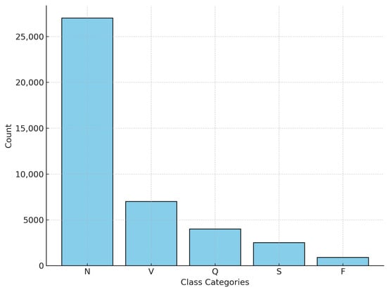 These annotations label various arrhythmic and normal beats, which were consolidated into five target classes based on the standards of AAMI, as shown in Table 1 [30]. The dataset contains a total of 44,408 samples, of which 33,370 were allocated for training and 8,343 for testing. An important challenge is the class imbalance problem: the normal class represents the majority of the available samples, while other arrhythmia classes are significantly underrepresented, as illustrated in Figure 1.