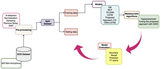 The proposed approach to the diagnosis of arrhythmias, illustrated in Figure 2, follows a structured process to improve the accuracy of arrhythmia detection and classification. The process begins with preprocessing ECG signals from the MIT-BIH Arrhythmia Database, which includes R-peak detection, normalization, sampling, noise removal, and the DWT to ensure high-quality input data. After preprocessing, the dataset is divided into training and testing sets for model evaluation.