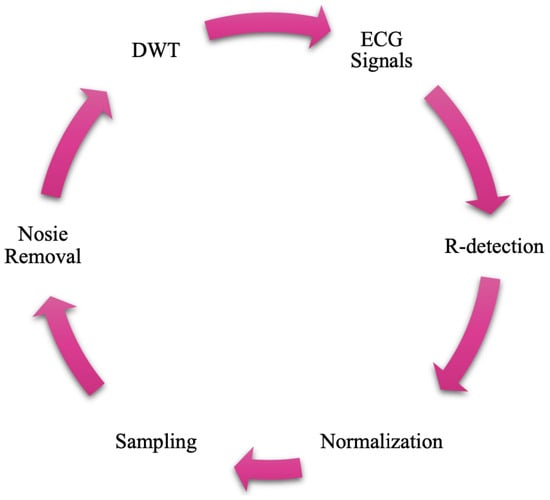 Preprocessing plays a crucial role in accurately detecting arrhythmias during ECG signal analysis. Figure 3 illustrates the preprocessing pipeline applied to the ECG signals prior to classification. The process begins with the acquisition of raw ECG signals, followed by R-peak detection to accurately segment individual heartbeats. Normalization is then applied to standardize amplitude variations across signals, ensuring consistency. A sampling step is introduced not only to extract fixed-length heartbeat segments but also to address the issue of data imbalance across different arrhythmia classes, thereby ensuring a more balanced representation of samples. Subsequently, the DWT is applied to remove baseline wander and high-frequency noise. This sequence of steps enhances signal quality and preserves the morphological and temporal features essential for reliable arrhythmia classification.