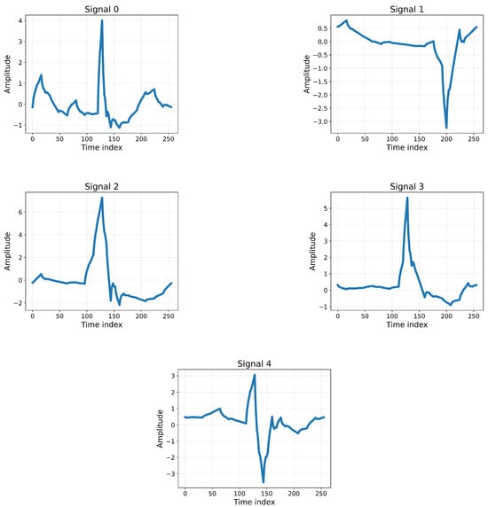In particular, we can observe the essential features of the ECG signals: the types of beats and the quality of the signal. The x-axis corresponds to the time index (signal time points), while the y-axis represents the amplitude of the ECG signal. A closer look at the samples reveals distinct characteristics: Sample 0 appears regular with a clearly distinguishable P wave, QRS complex, and T wave; Sample 1 is also near-regular but shows slight abnormalities; Sample 2 demonstrates minor deviations but remains close to a normal baseline; Sample 3 exhibits stronger fluctuations and noticeable differences, especially in the ST segment, suggesting possible abnormality; and Sample 4 shows a less distinct QRS complex with a prolonged QT interval, which may indicate underlying cardiac conditions. These illustrative variations highlight the physiological complexity of ECG signals and justify the use of advanced deep learning methods for reliable arrhythmia detection.