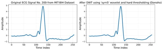 Here, represents the estimated noise level, denotes the detail coefficients, and n is the length of the signal. A hard thresholding operation is applied to suppress noise components, while approximation coefficients are retained. The denoised signal is then reconstructed using the inverse DWT. The processed ECG signals after applying the DWT are shown in Figure 5, which clearly demonstrates the preservation of essential ECG features, such as R-peaks, while reducing unwanted noise.
