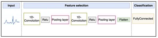 The 1D-CNN, which utilizes convolution and pooling layers, aims to identify characteristics indicative of different aspects of heart behavior. Thus, it is suitable for the detection and classification of arrhythmias [39]. The input data are processed through filters in the convolutional layer that identify patterns and shapes at different levels of abstraction to extract meaningful features.