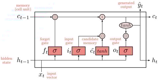 Here, represents the sigmoid activation function and tanh represents the hyperbolic tangent activation function. The matrices and vectors of weights——along with the bias vectors (), determine the operation of the gates. The ⊙ symbol indicates element-wise multiplication. The gates operate similarly to traffic controllers, regulating the movement of information through the cell state and ensuring that only relevant data is passed through. The input gate updates the cell’s memory based on the previous memory block and the tanh function, while the output gate produces the final output of the current LSTM block.