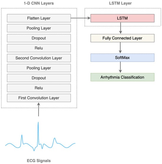 This approach utilizes a 1D-CNN as a feature extractor to identify significant spatial patterns in ECG signals, while an LSTM network captures crucial temporal dependencies to distinguish between different types of arrhythmia. The proposed 1D-CNN-LSTM model integrates these two architectures, allowing the CNN to extract spatial features while LSTM processes sequential patterns, thereby improving classification performance.