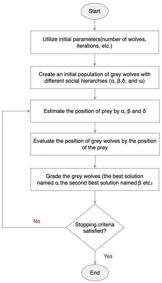 To further enhance the model’s effectiveness, a metaheuristic optimization technique, the GWO, is employed to automatically fine-tune the hyperparameters of the proposed hybrid model. By mimicking the leadership hierarchy and hunting behavior of gray wolves in nature, the GWO improves the search for optimal parameter configurations, reducing the need for manual tuning and contributing to better performance.