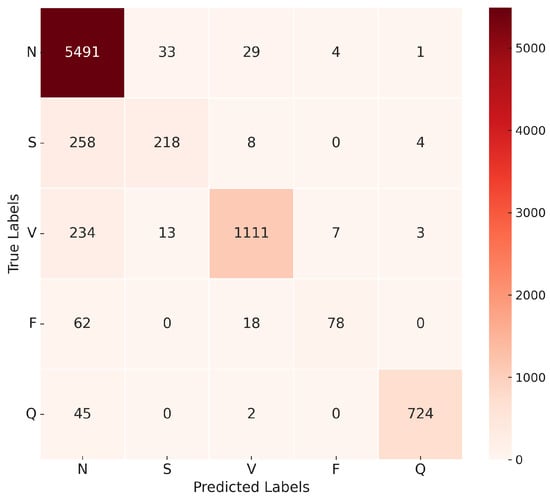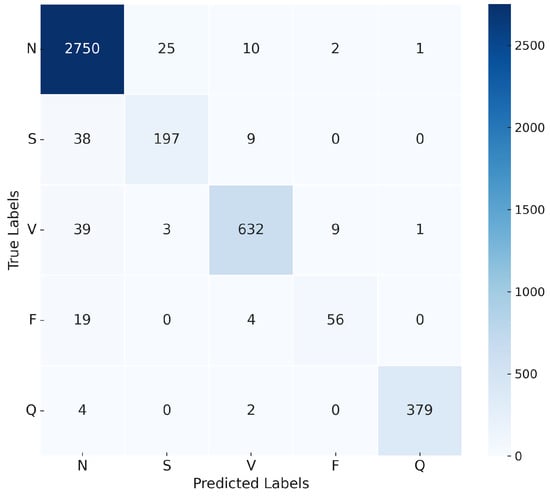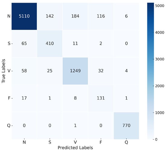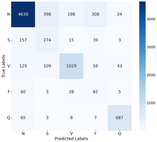 The confusion matrix in Figure 16 illustrates the model’s ability to distinguish between the five classes of ECG recommended by AAMI. The matrix shows a high true positive rate for the N and V classes, with minor misclassifications occurring in the S and F classes.