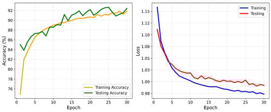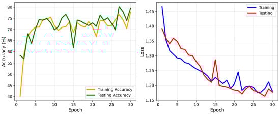 The 1D-CNN model was implemented in PyTorch version 2.8.0 and trained on GPU: Tesla T4, Memory: 14.74 GB. The training was performed for 30 epochs with a batch size of 20. The Adam optimizer was employed with a learning rate of 0.00015. To mitigate class imbalance, a weighted cross-entropy loss function was used. During training, accuracy and loss were monitored on both training and testing sets across all epochs to ensure stable convergence.
