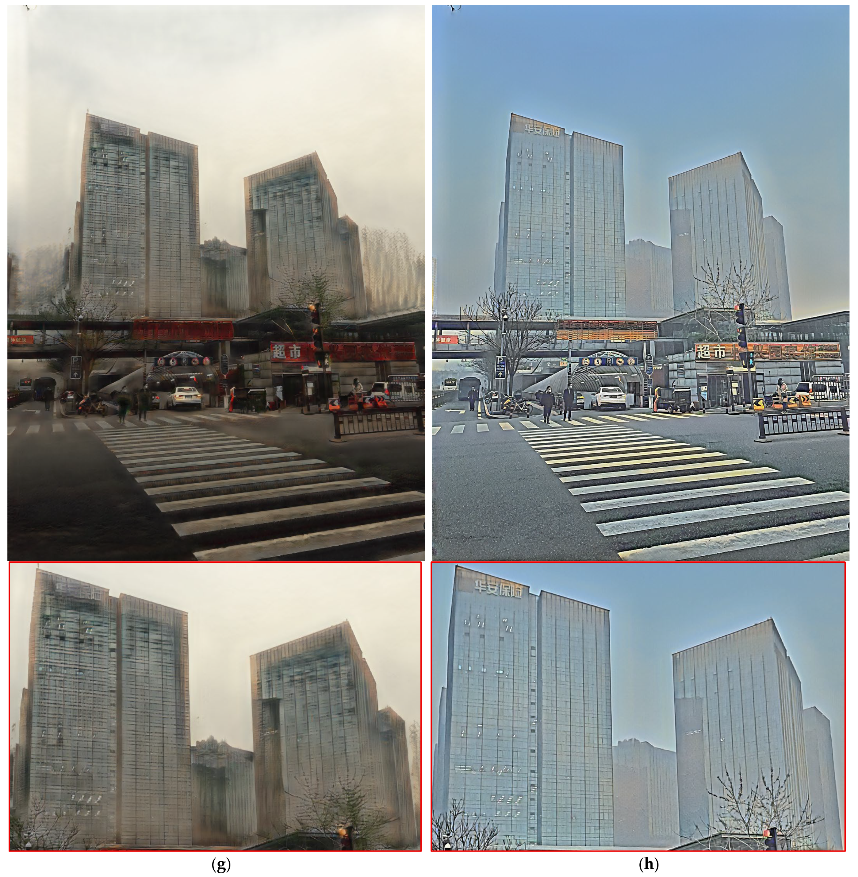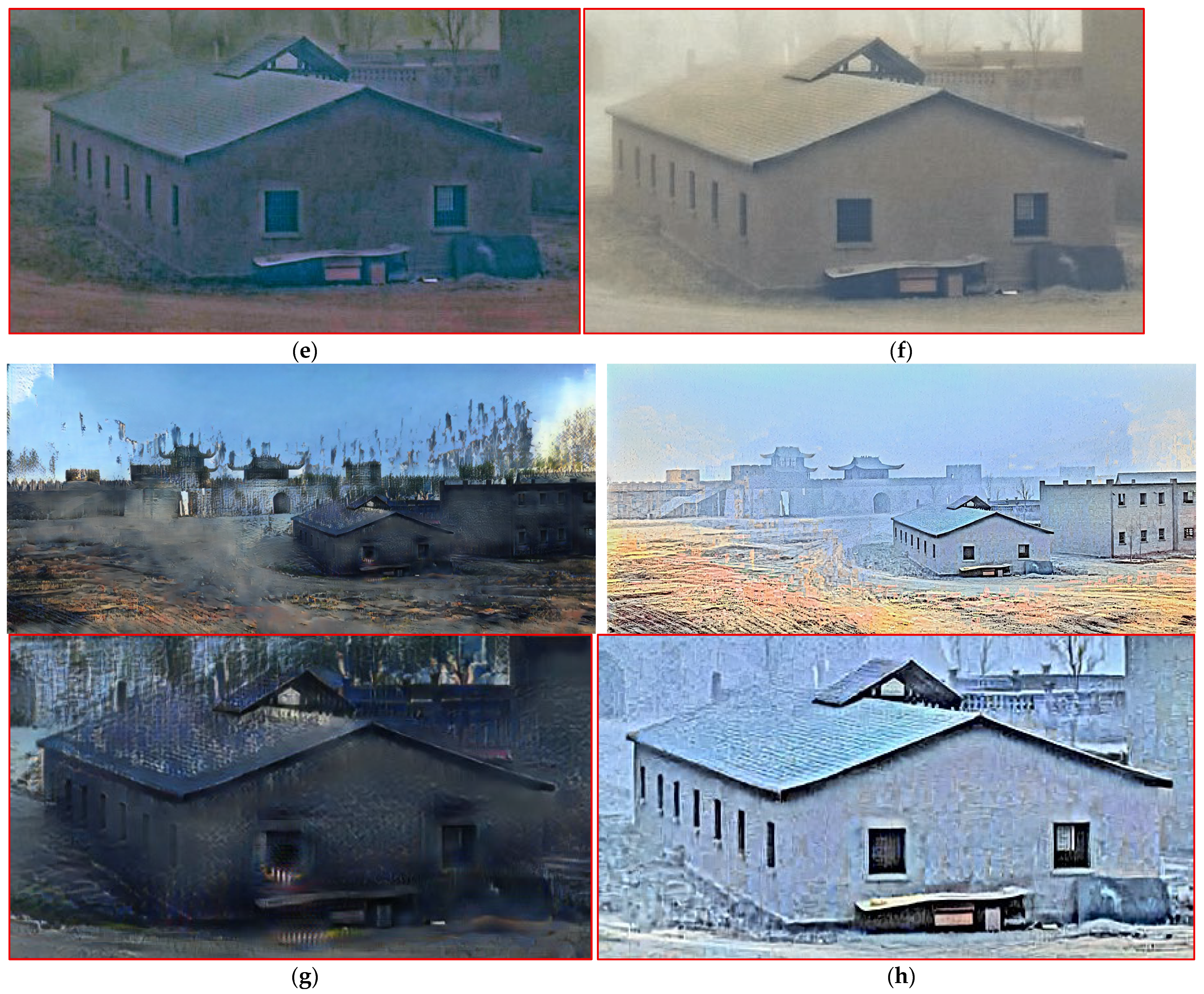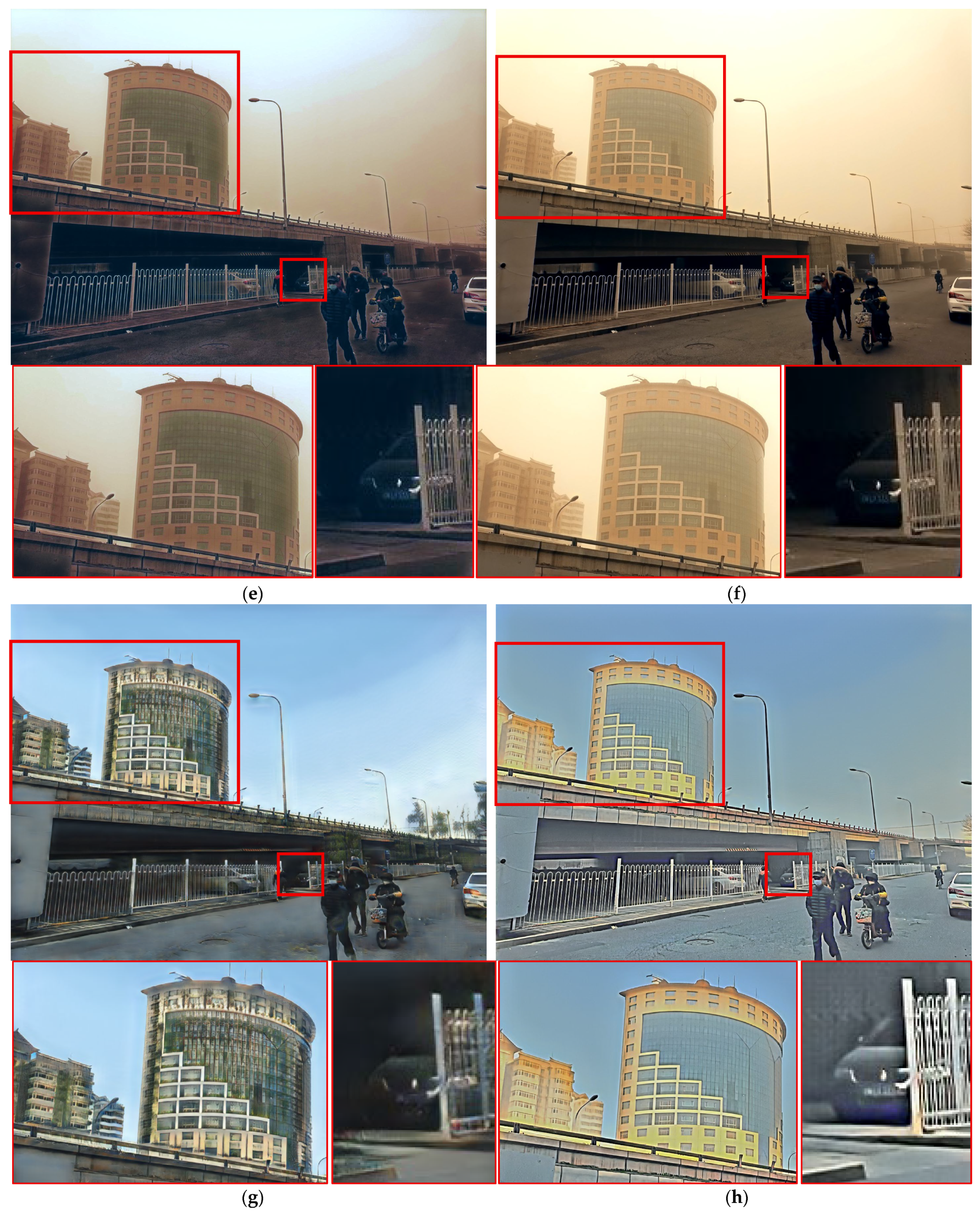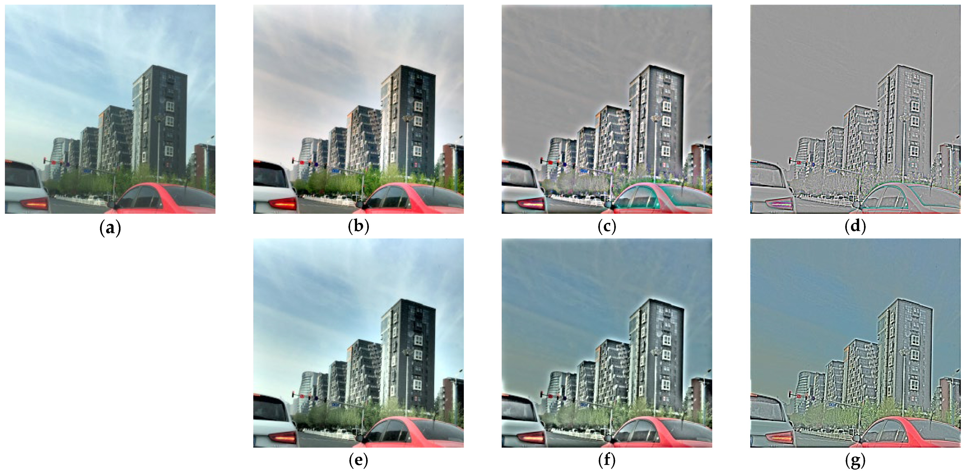 Figure 9b, with a halo appearing in the sky portion. While small-scale Retinex enhances image details, it tends to generate noise and artifacts that can be propagated or amplified during CycleGAN learning.