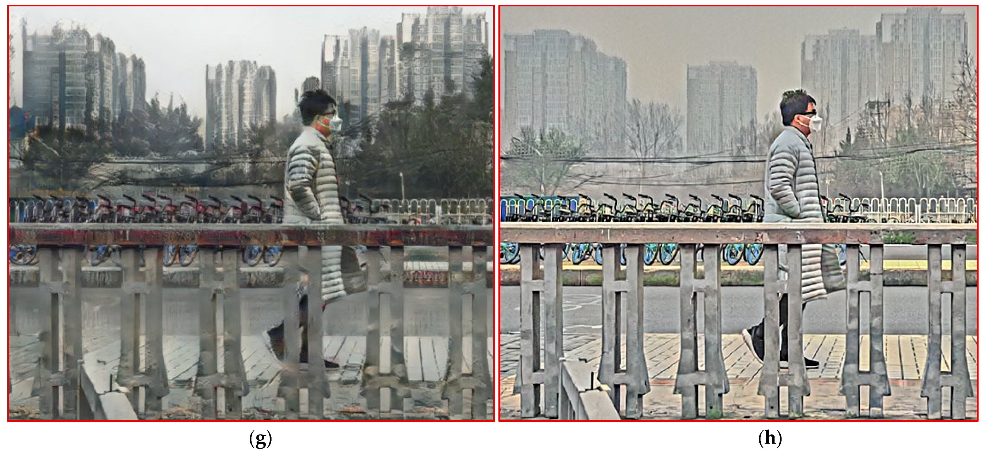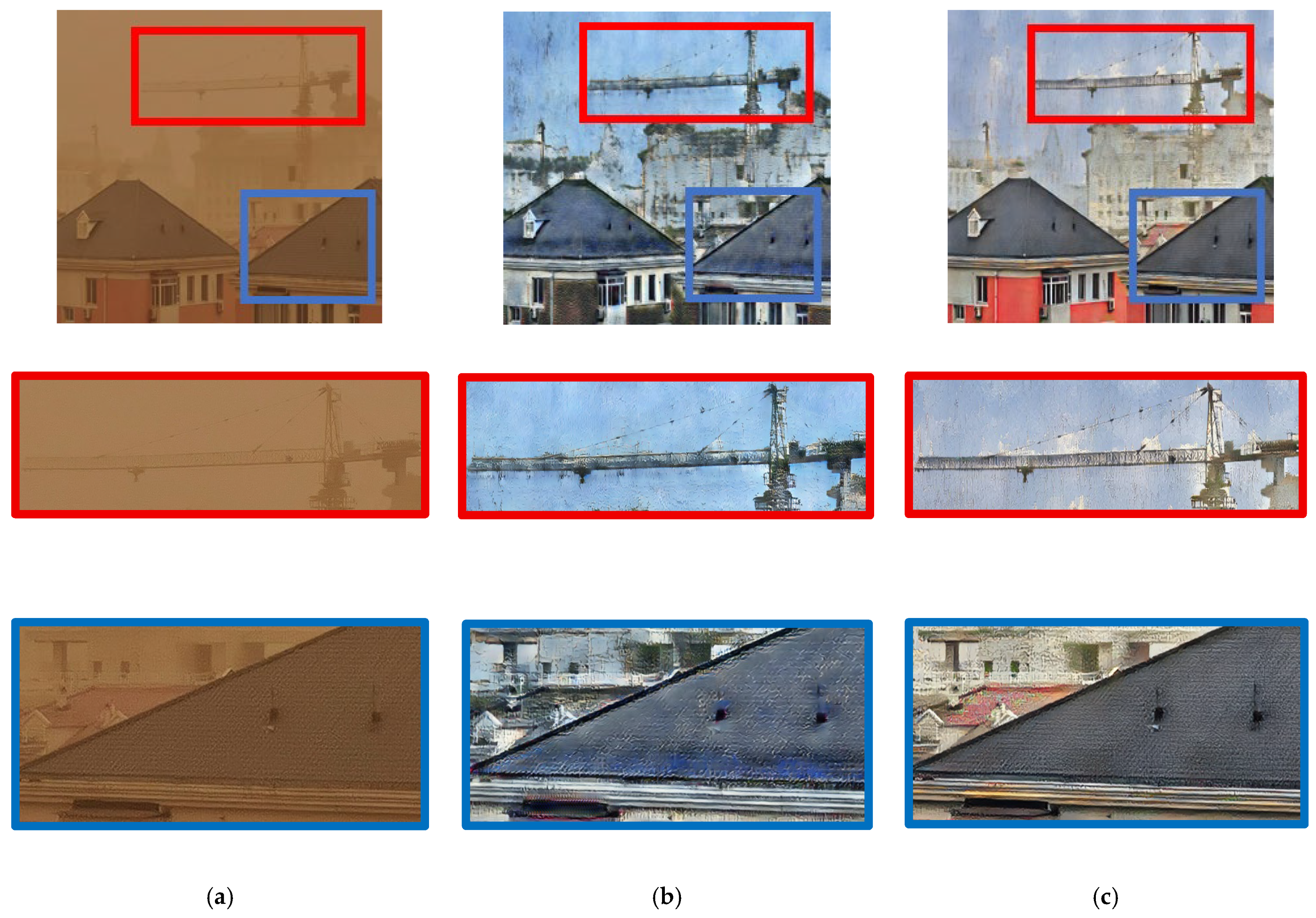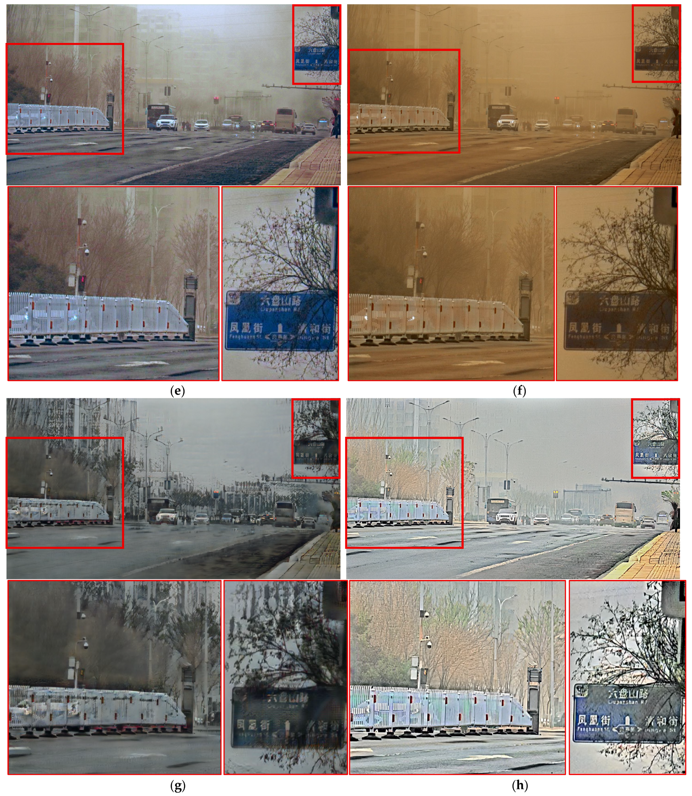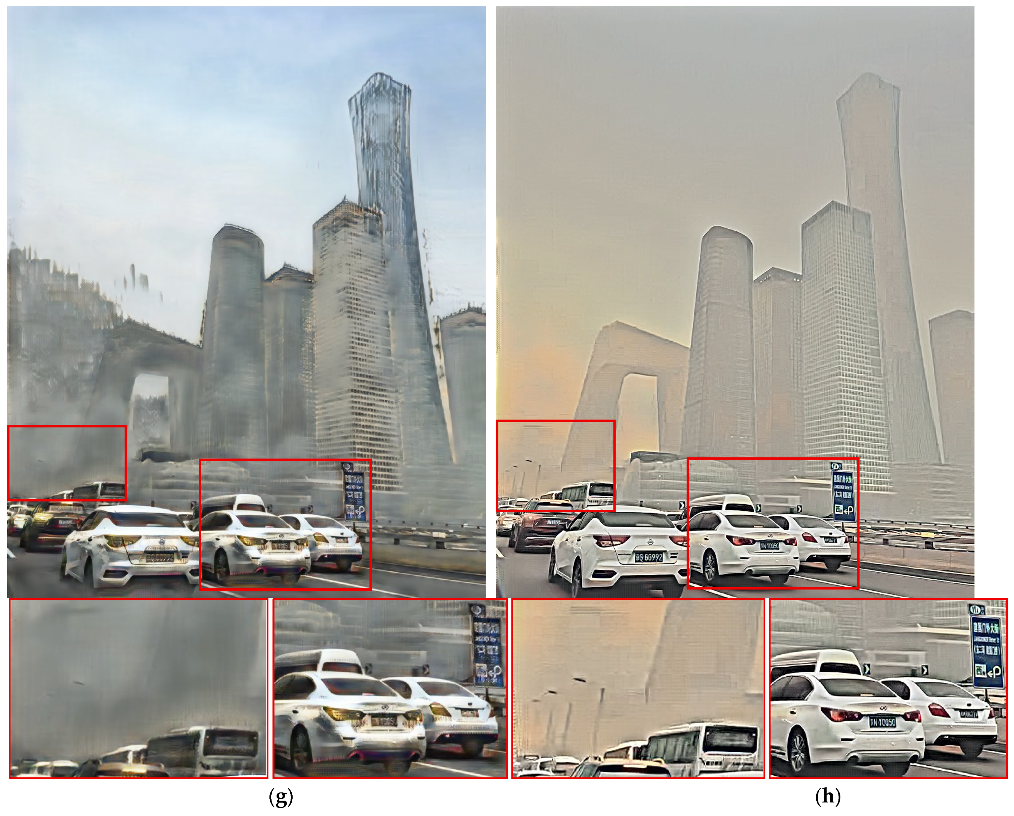 Figure 9b, with a halo appearing in the sky portion. While small-scale Retinex enhances image details, it tends to generate noise and artifacts that can be propagated or amplified during CycleGAN learning.