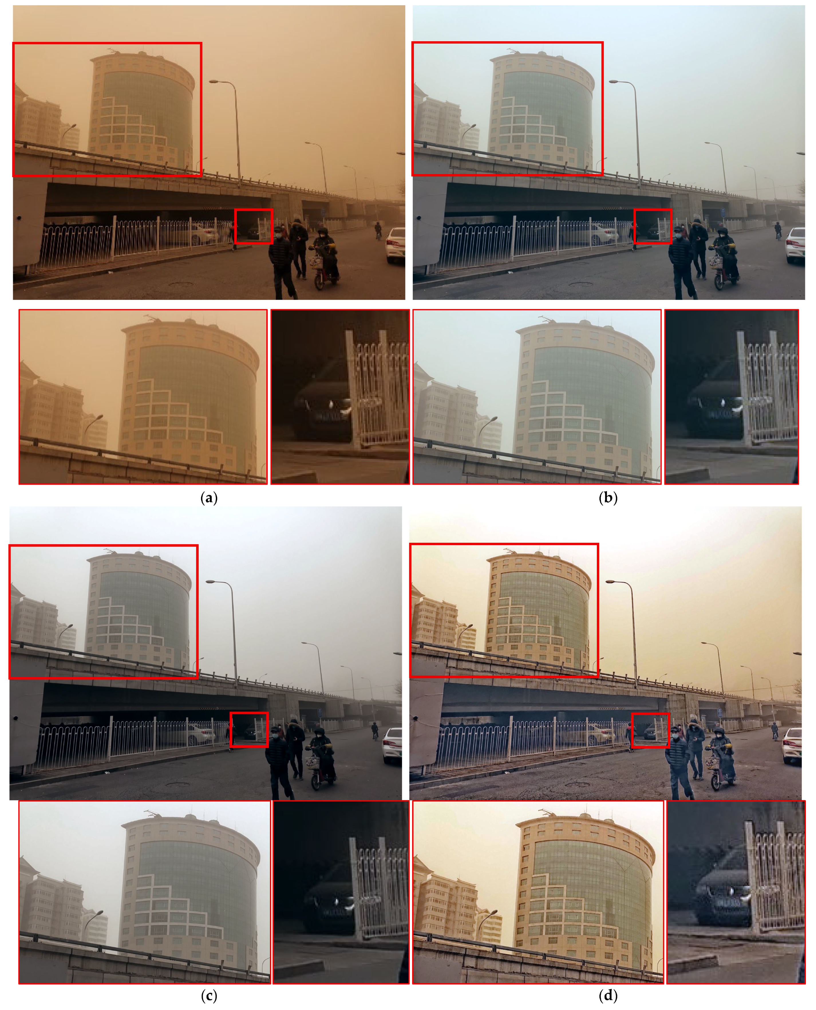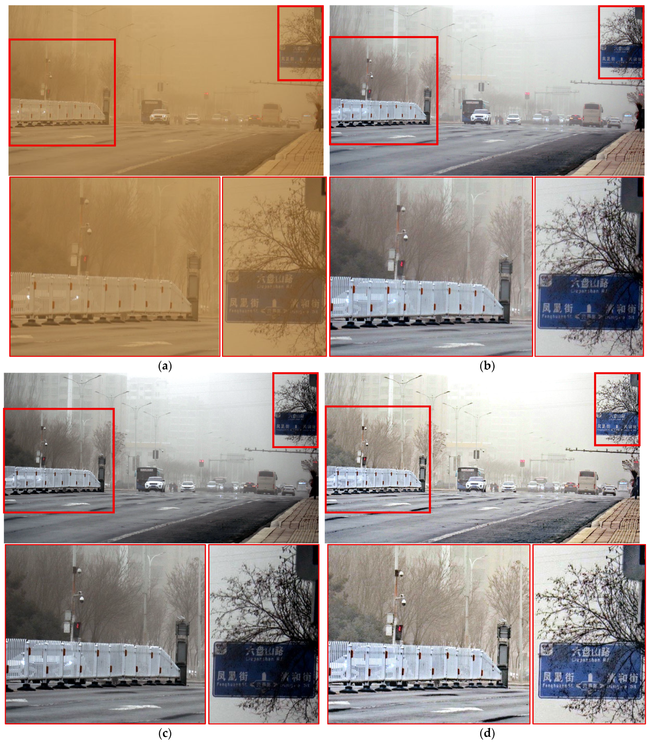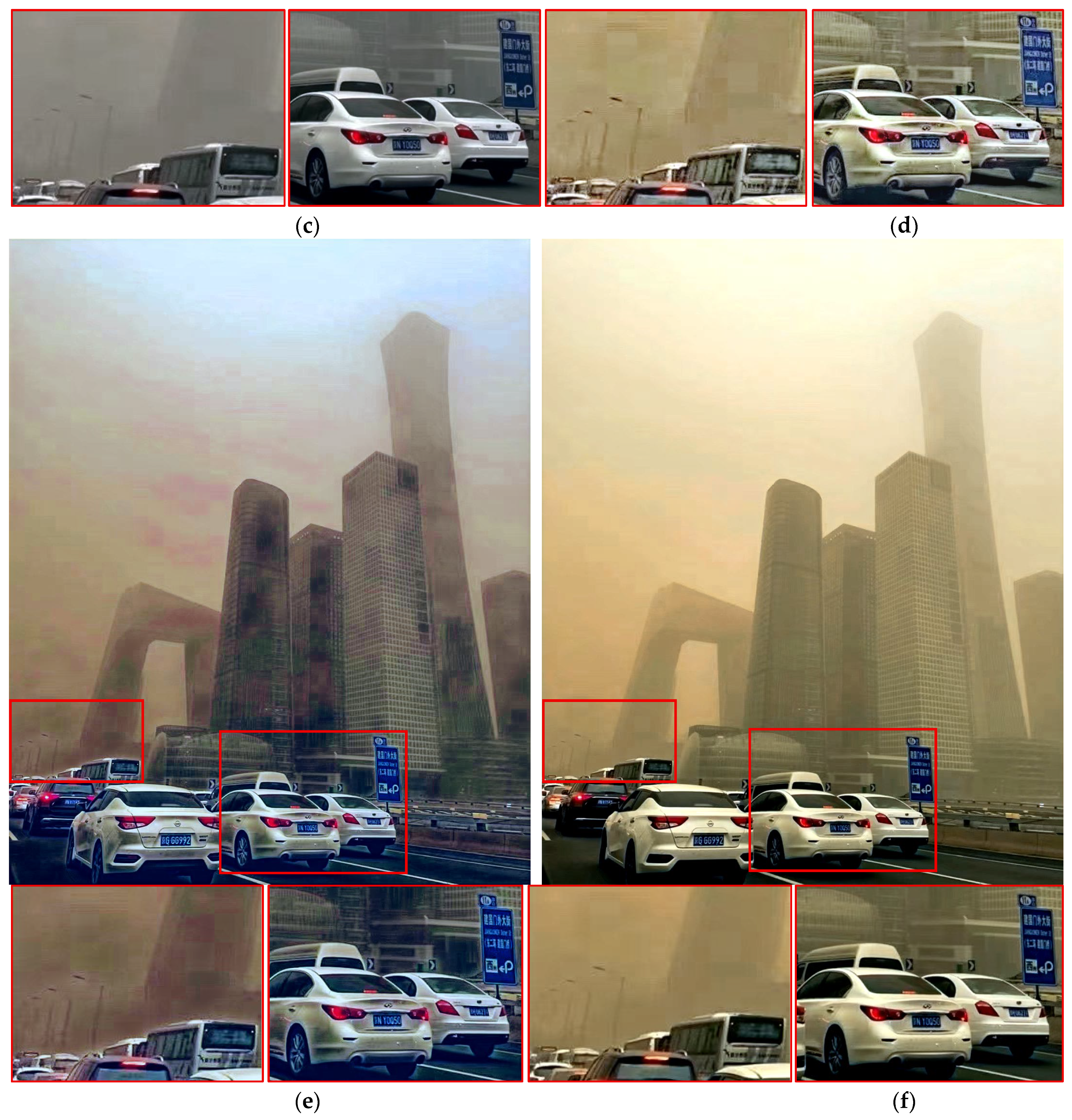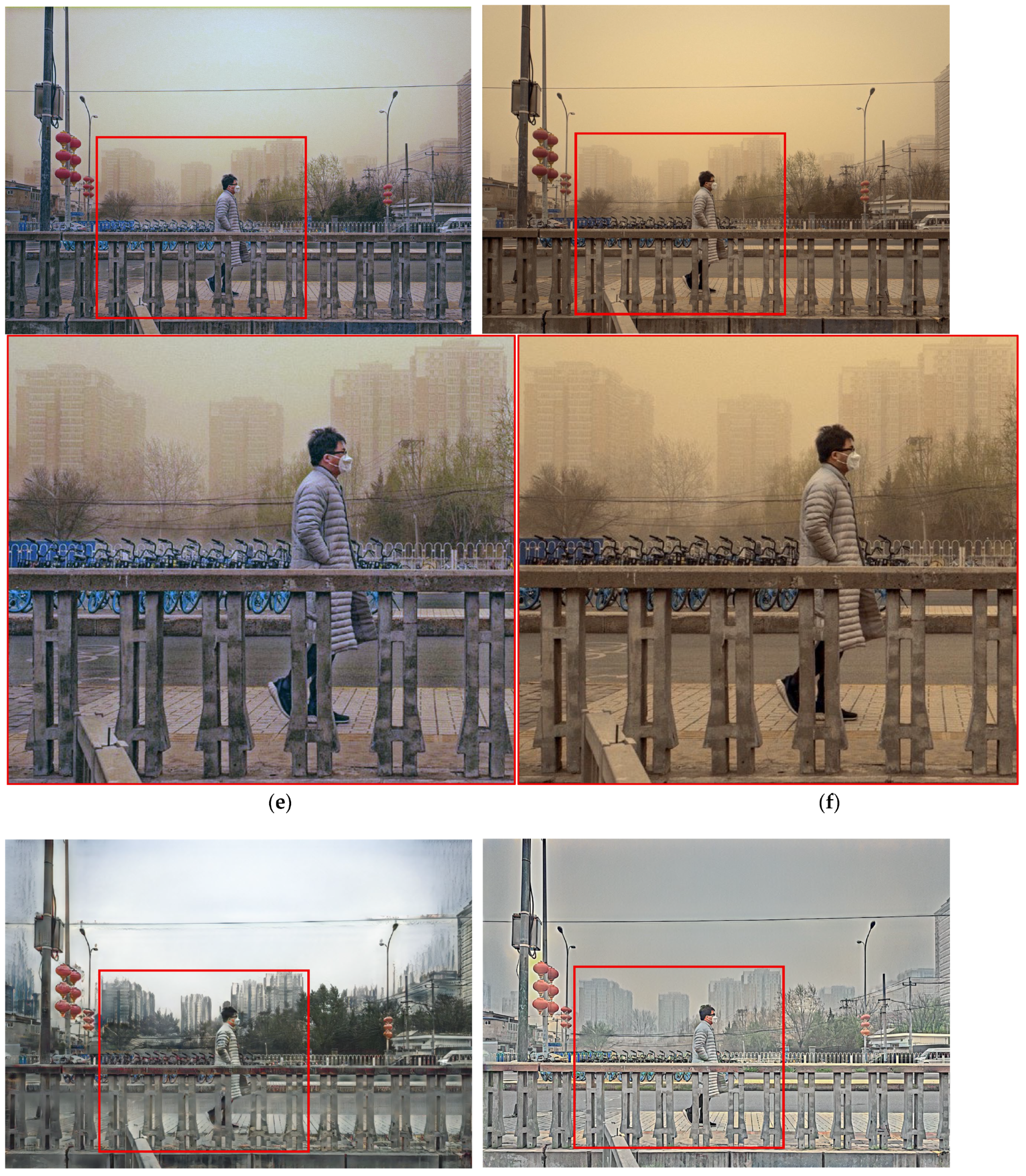 Figure 9b, with a halo appearing in the sky portion. While small-scale Retinex enhances image details, it tends to generate noise and artifacts that can be propagated or amplified during CycleGAN learning.