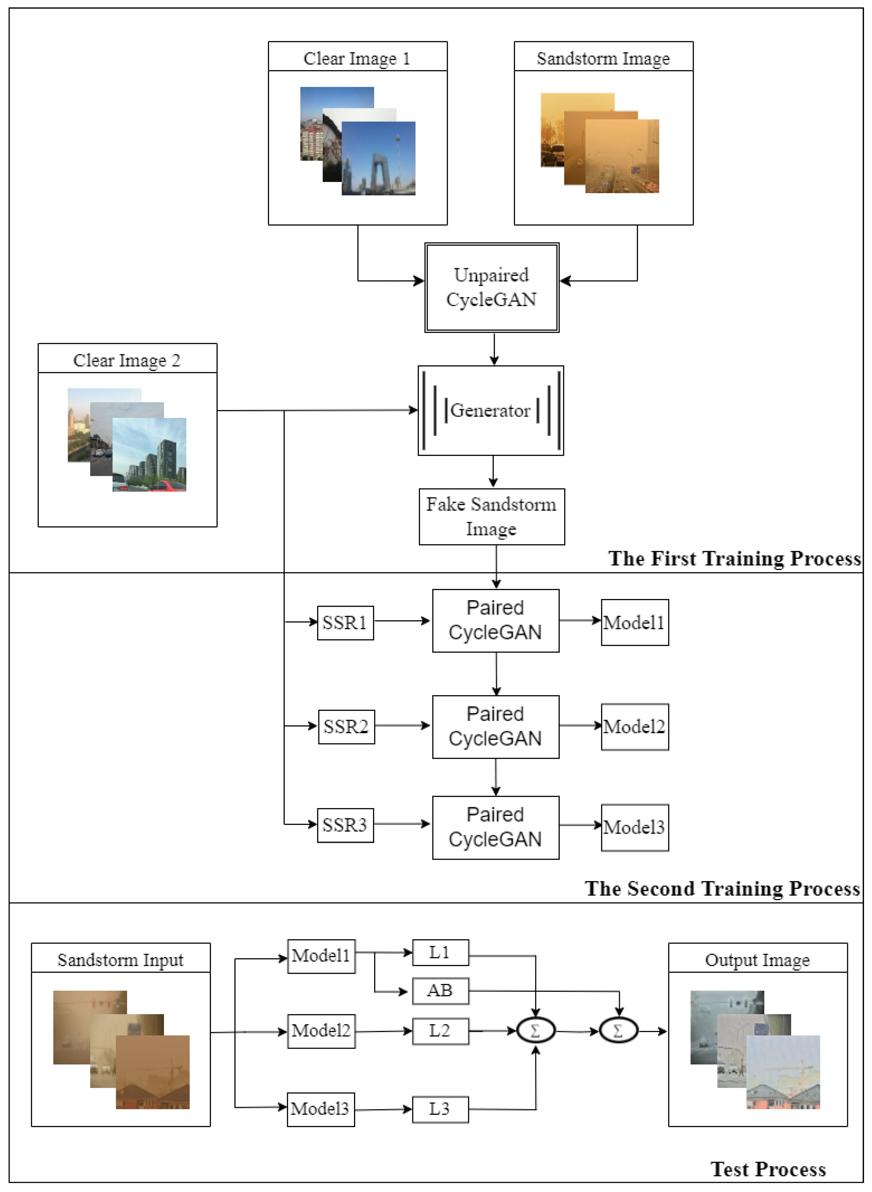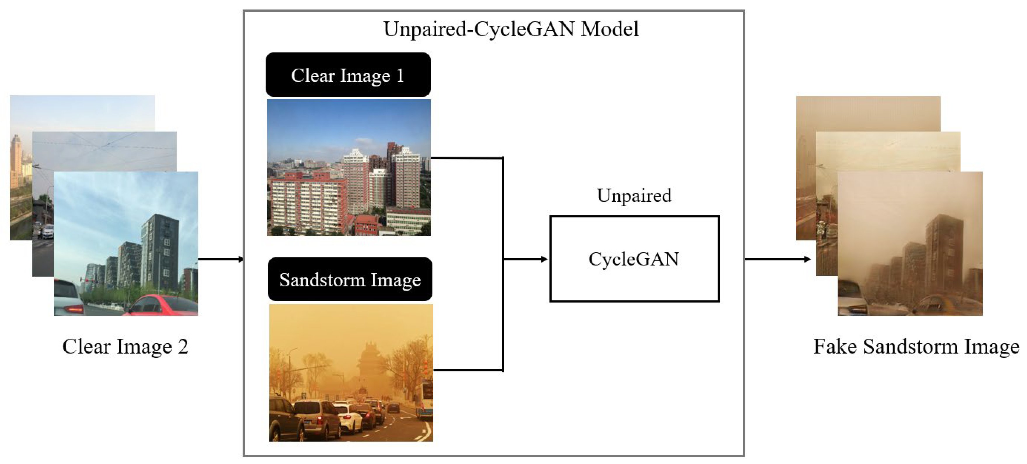 Figure 5. The first training step involved the generation of fake dust-interference images. This stage was conducted using a dataset consisting of 2000 clear images (referred to as Clear Image 1) and 250 real sandstorm images. Because CycleGAN learning with unpaired data requires a substantial amount of authentic sandstorm-obscured images, their scarcity in real life hampers its progress. Consequently, our approach employed CycleGAN with unpaired data for the initial learning process and runs the generator in the “clear to sandstorm” direction. This initial learning phase provided a substantial dataset of paired images to facilitate subsequent learning steps.