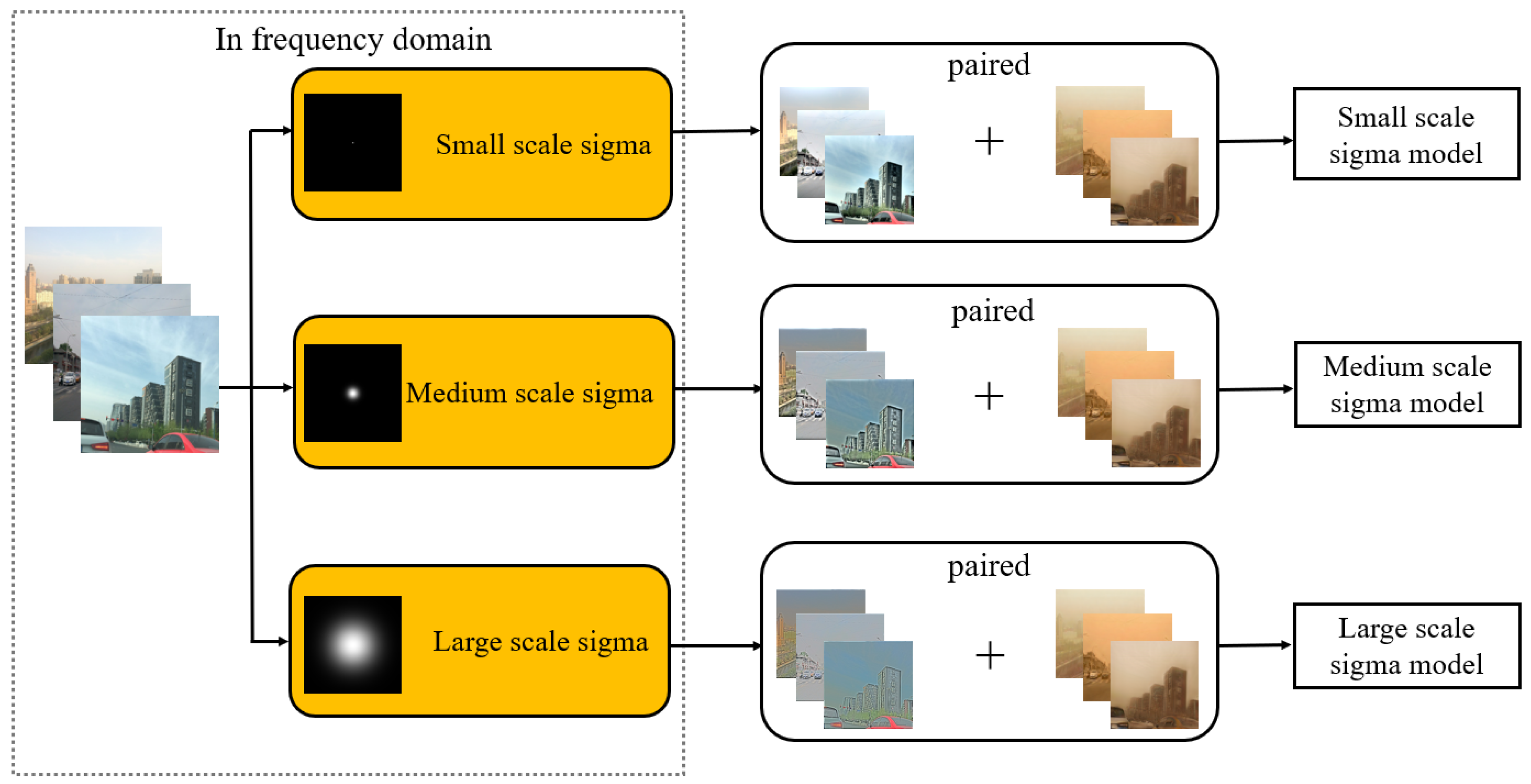 Since Retinex has the property of removing background components while enhancing image sharpness and brightness, this study employed SSR to guide the learning direction. It was hypothesized that this approach could suppress the global yellow cast and background effects caused by sandstorms while improving image details. In addition, the characteristics of SSR vary with the sigma scale in the frequency domain: a larger sigma results in a narrower frequency response that suppresses high-frequency components and emphasizes low-frequency information, whereas a smaller sigma produces a wider frequency response that allows more high-frequency components to pass through, thereby preserving details with less color distortion. To exploit these properties, three sigma scales were individually trained to generate independent modules, and their outputs were then fused to incorporate the advantages of MSR (Multi-Scale Retinex). For color preservation, the AB channels obtained from the small sigma (1-scale) were used to maintain natural color representation, while the L channel was derived by combining the outputs of the three scales and processed in the LAB space to ensure both detail enhancement and color fidelity.