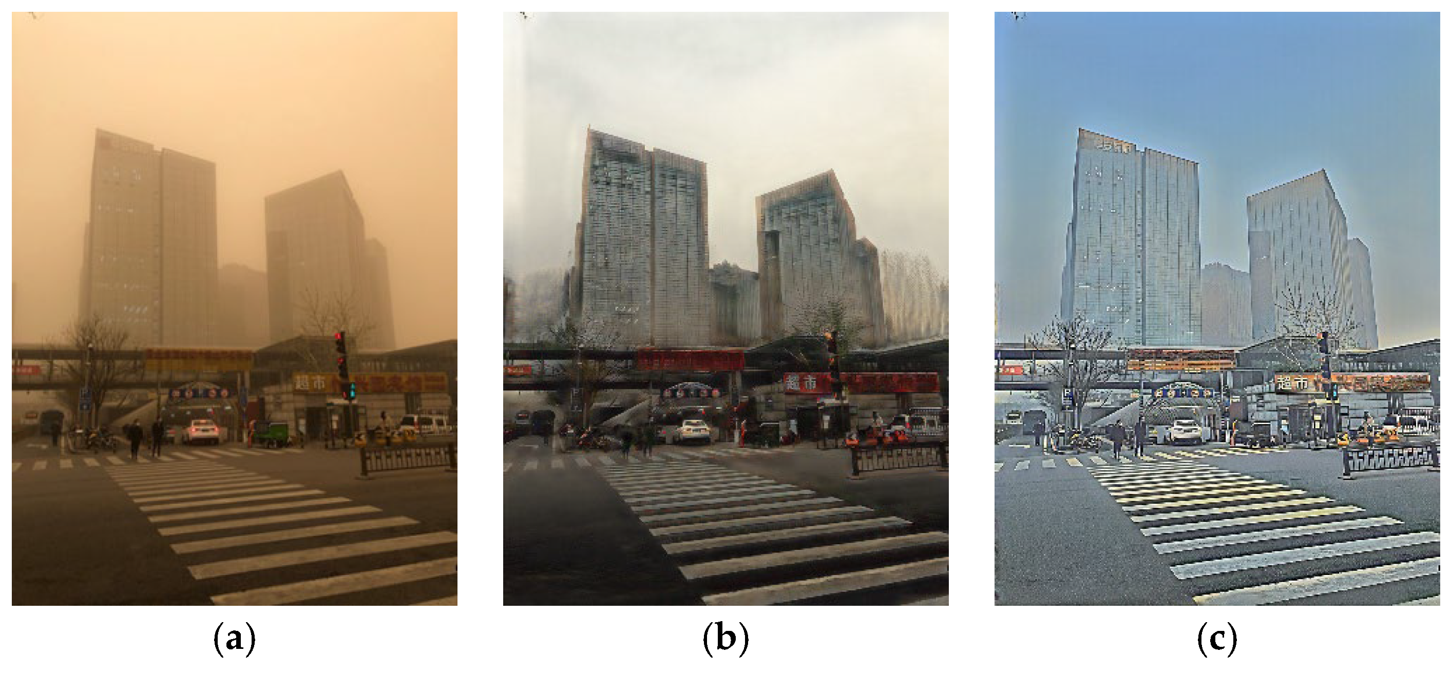 CycleGAN is designed to use unpaired data, and its generator objective function leverages the discriminator adversarial loss to drive the generated samples toward the distribution of the target domain. However, the primary advantage of training CycleGAN with paired data is its ability to leverage paired information to guide the learning process. The objective function of the generator directly includes the mapping error term. Paired data provide explicit pixel-level correspondence between images from different domains, which means that the model can directly learn the mapping between two domains and the pixel-level correspondence. This approach can better capture image features and reduce ambiguity and uncertainty in the drawing process, resulting in more visually appealing and accurate transitions between domains. The results of using CycleGAN for clear and sandstorm-obscured images are shown in